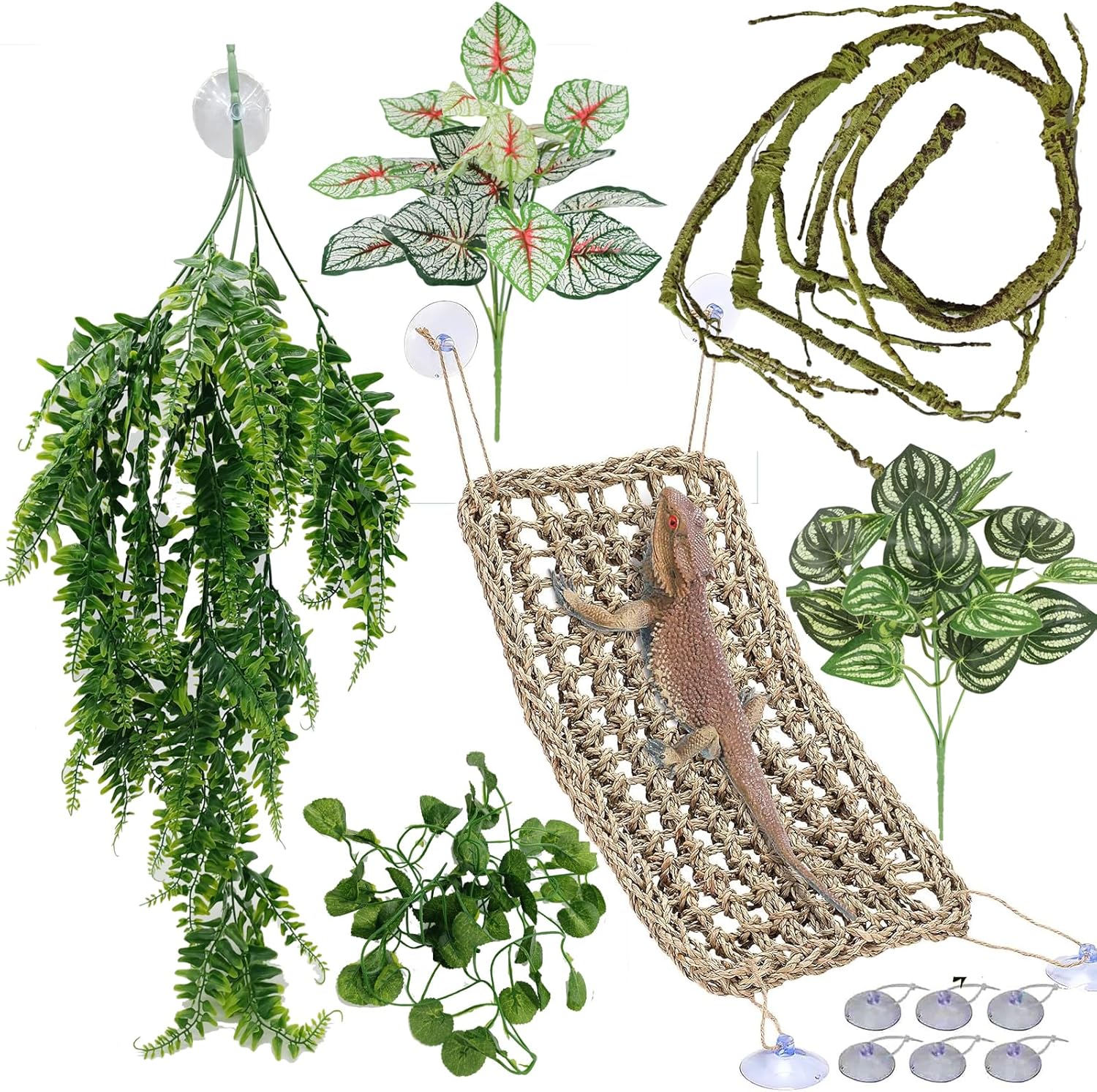 - 【Suitable for】Bearded dragons, lizards, chameleons, triceratops, tree frogs, geckos,crested gecko, baby iguanas, turtles, hermit crabs, snakes and other reptiles. The Reptile fake vine plants and bendable vine with leaves can decorate habitats also be used to decor household items.