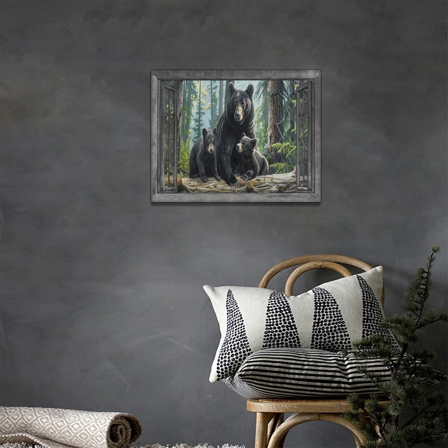 Black Bear Wall Art Forest Window Canvas Cabin Living Room Pictures Prints Animal Wall Decor Painting Artwork for Bedroom Dining Office Home 16"x12"