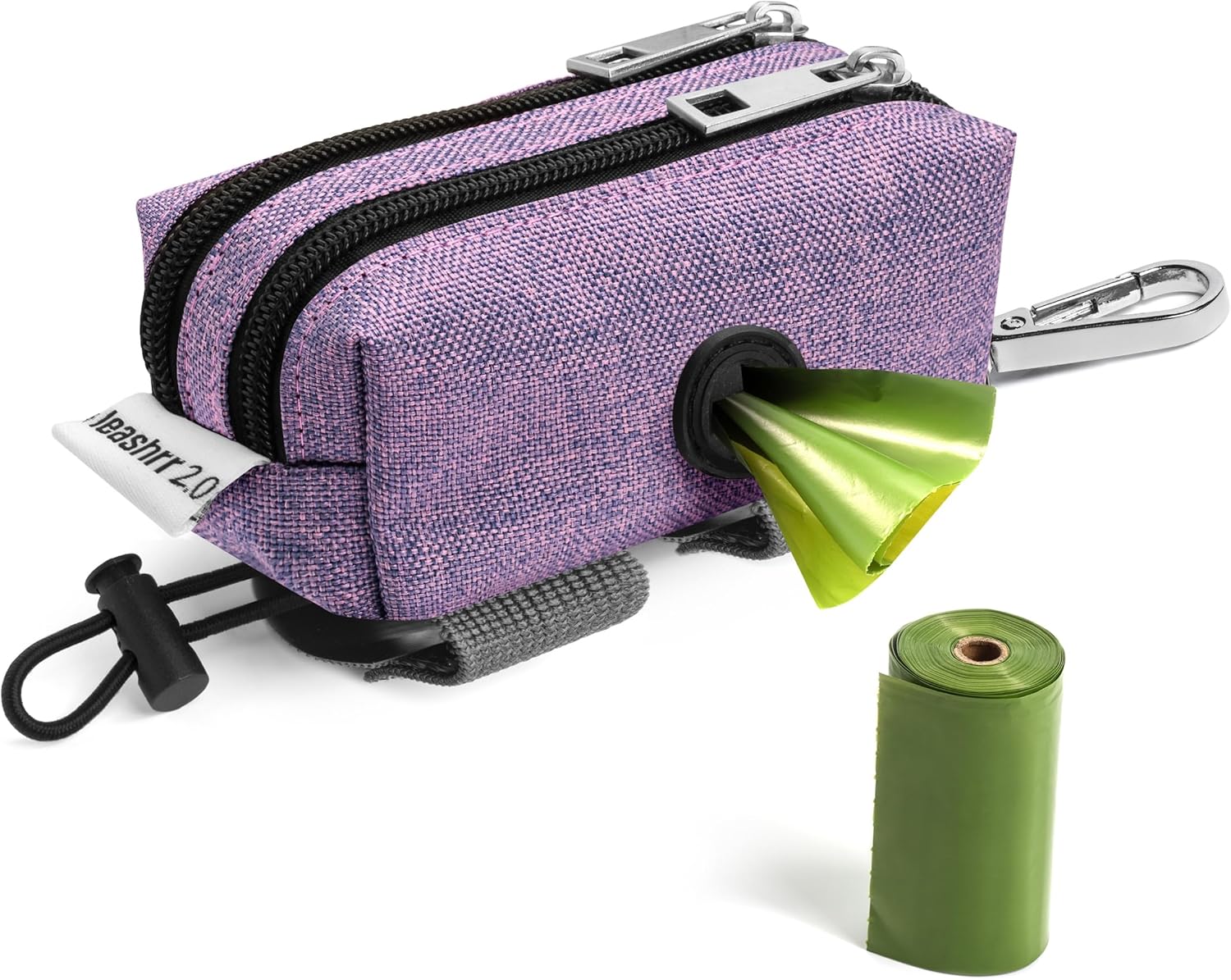 Dog Poop Bag Holder for Leashes - Dog Poop Bag Dispenser and Treat Holder with 2 Waterproof Pouches for Pet Waste Bags and Walking Accessories + 1 Free Roll (Purple)