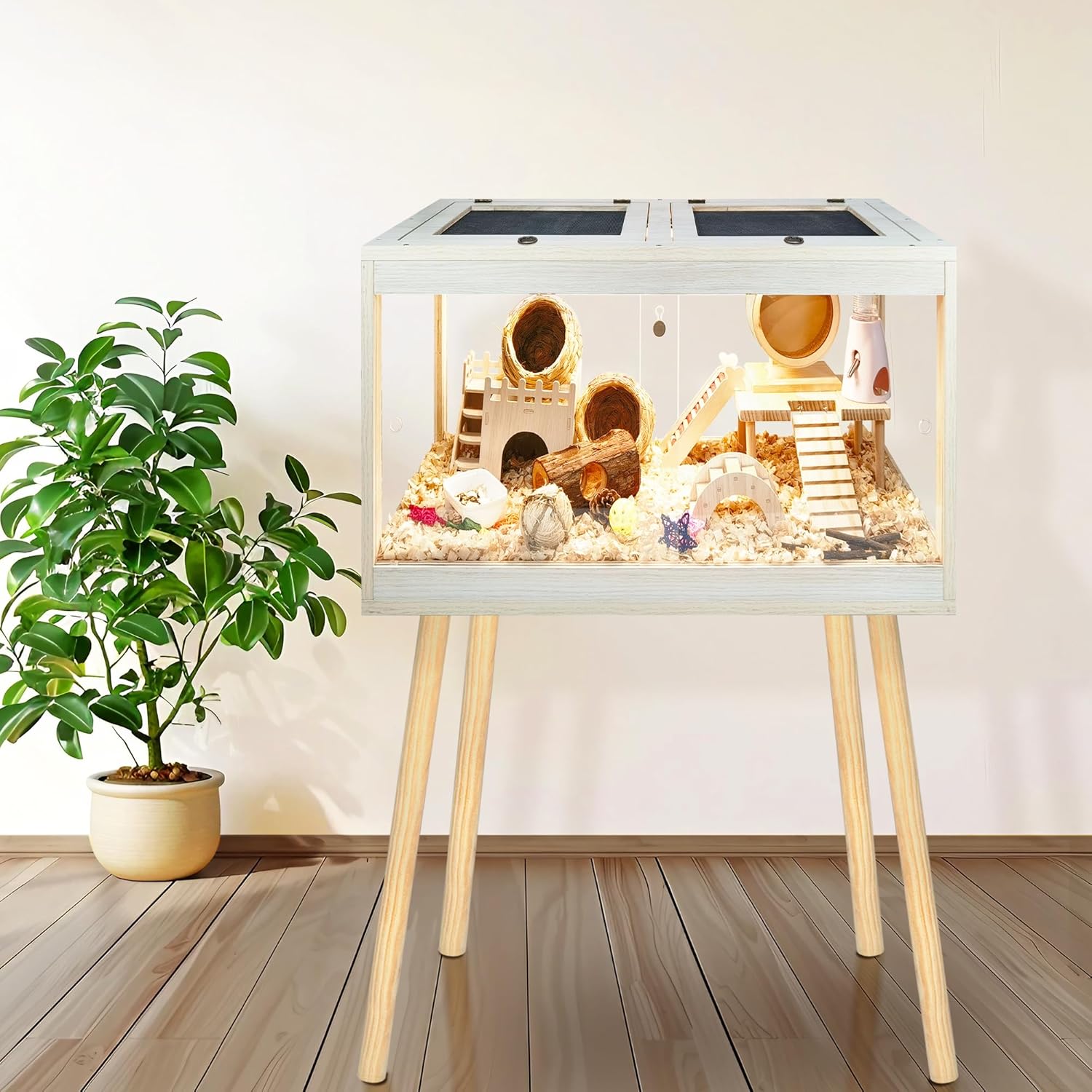 - 【Premium Quality Materials】Available in 4 sizes ranging from 24 to 48 inches in length, with 24 or 27.5 inches legs' height, please refer to picture 2 for size information. Crafted from durable, high-density natural wood treated with a rot-resistant, waterproof coating, our cage ensures longevity and aesthetic appeal. Transparent acrylic panels provide a clear view of your cherished hamsters' activities. An additional acrylic sheet on the cage bottom prevents moisture buildup, simplifying cleaning tasks.