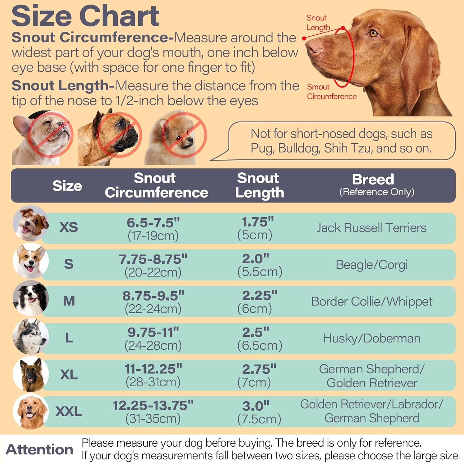 - Size XL (Cir: 11-12.25”, length: 2.75–3.5”) – This dog muzzle for large dogs fits Labradors, German Shepherds, Malinois, etc., but not for aggressive dogs, highly anxious dogs. Measure your dog's snout circumference and length per the size chart or video. If between sizes, SIZE UP! For dogs with longer snouts like Dobermans, choose based on both snout circumference and length. Ensure the muzzle fits comfortably, with the nose not touching the edge