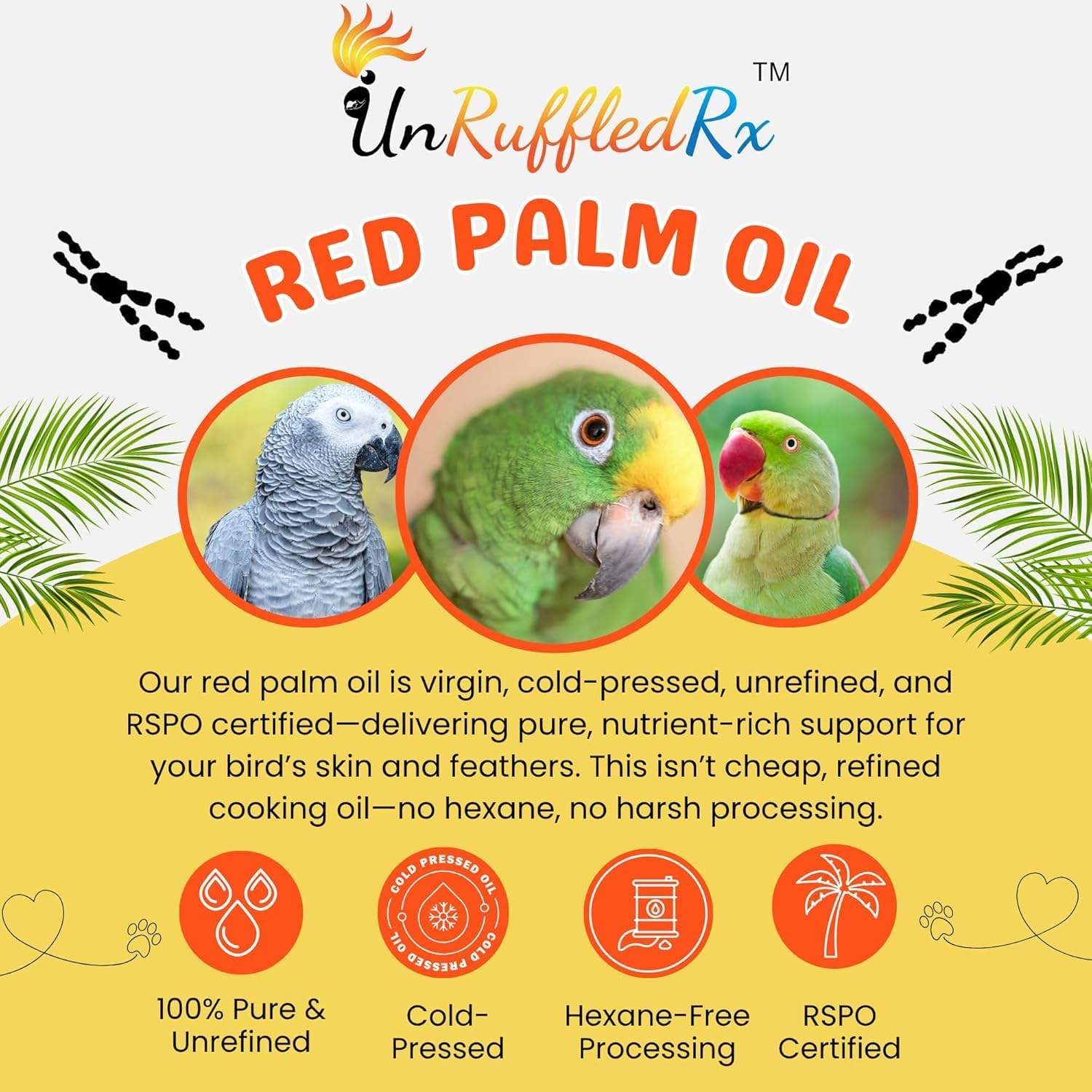 UnRuffledRx™ Red Palm Oil for Birds & Parrots – Supports Skin, Feather, Eye & Immune Health, Rich in Omega Fatty Acids, Antioxidants, Beta Carotene, & Vitamin E – 100% Natural
