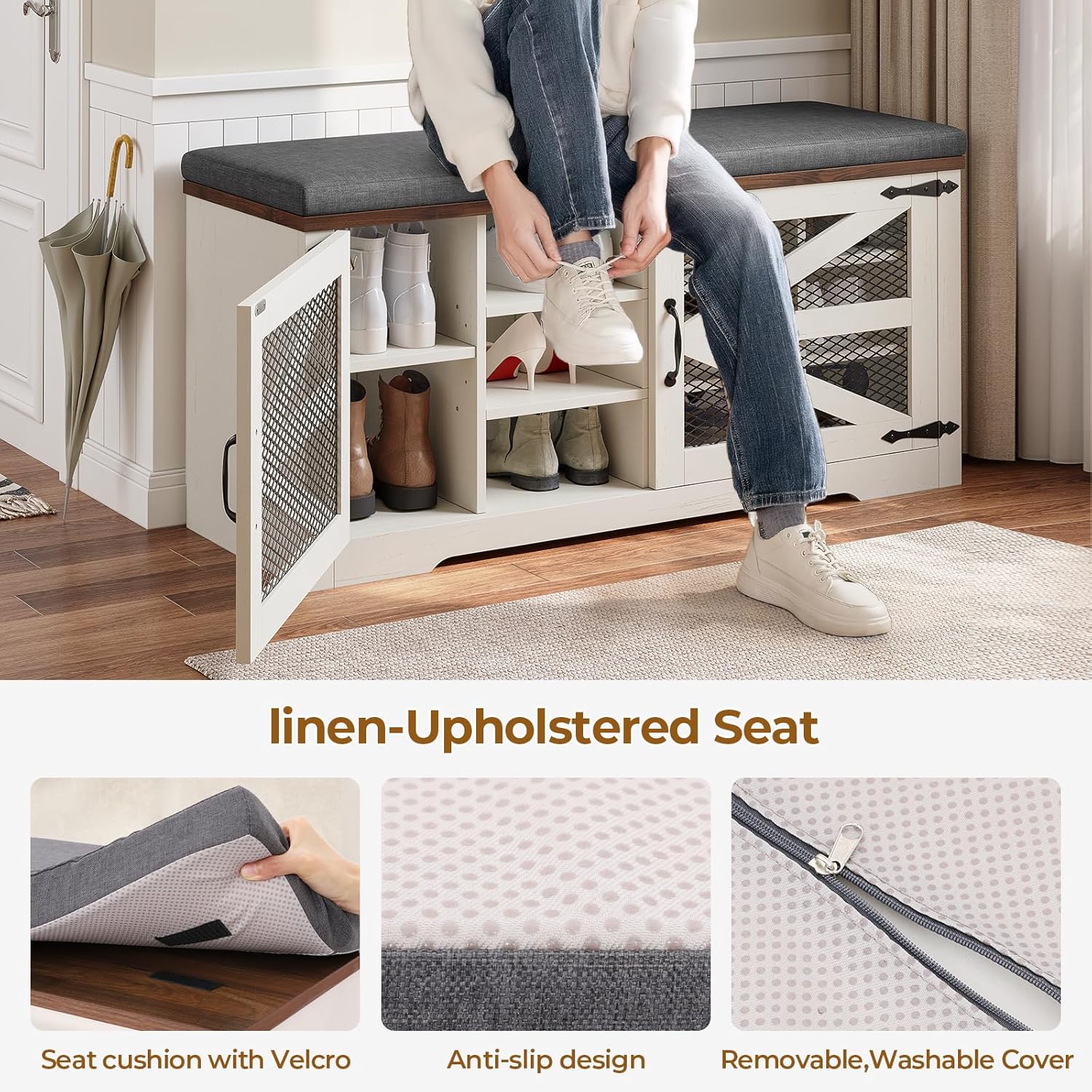 - COMFORTABLE AND CONVENIENT: This entry bench seat not only offers shoe storage but also comes with a soft cushion and an extra-long bench. It provides a comfortable seating area while putting on or taking off shoes. The soft and comfortable cushion adds to the overall convenience, keeping you in a good mood before heading out.