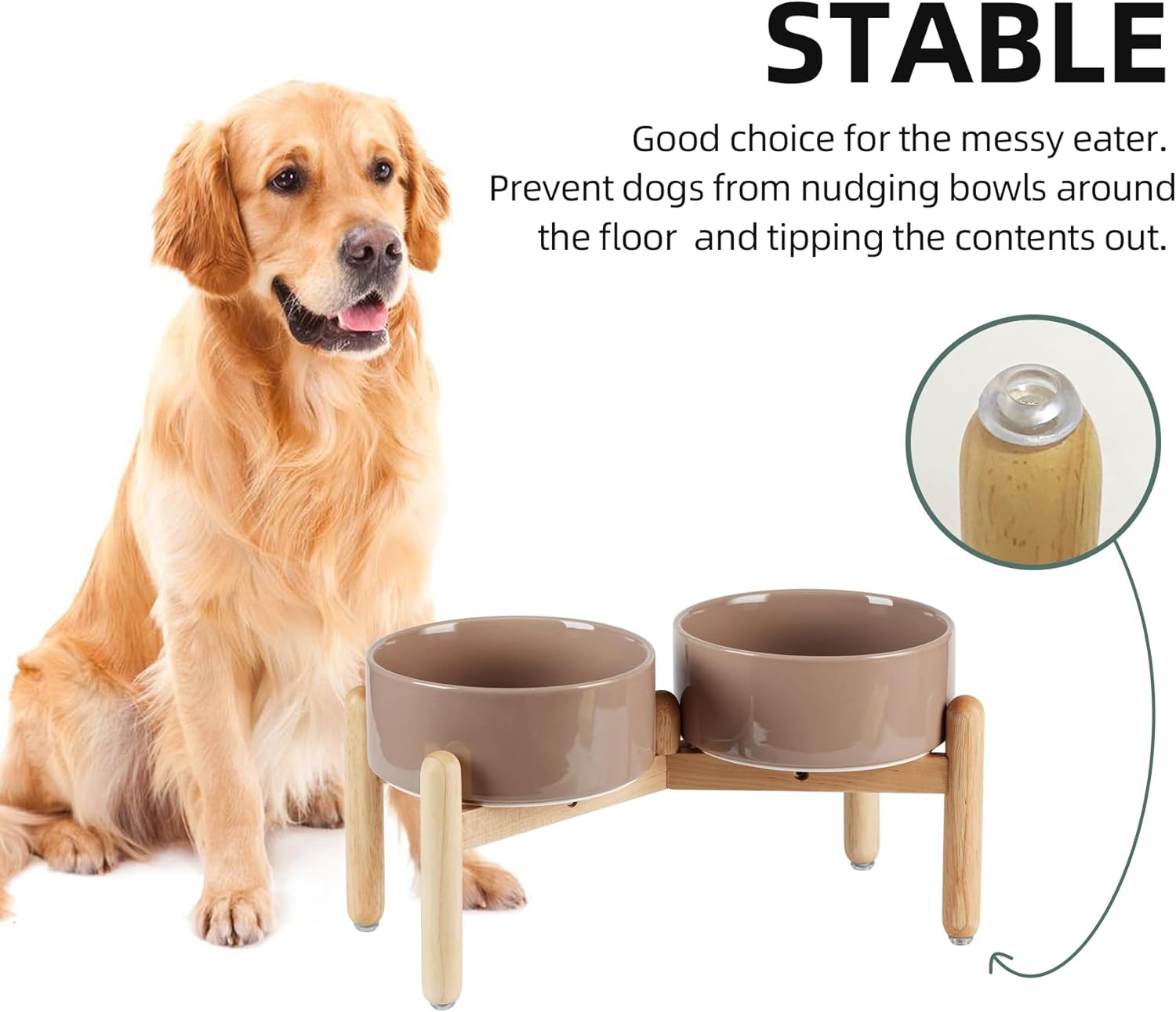 Ceramic 7.3inch Raised Double Bowls Set with Wooden Stand, Food & Water Bowls for Medium Breed Dogs, Weighted Dog Dishes, Pet Feeder(Brown Coffee)