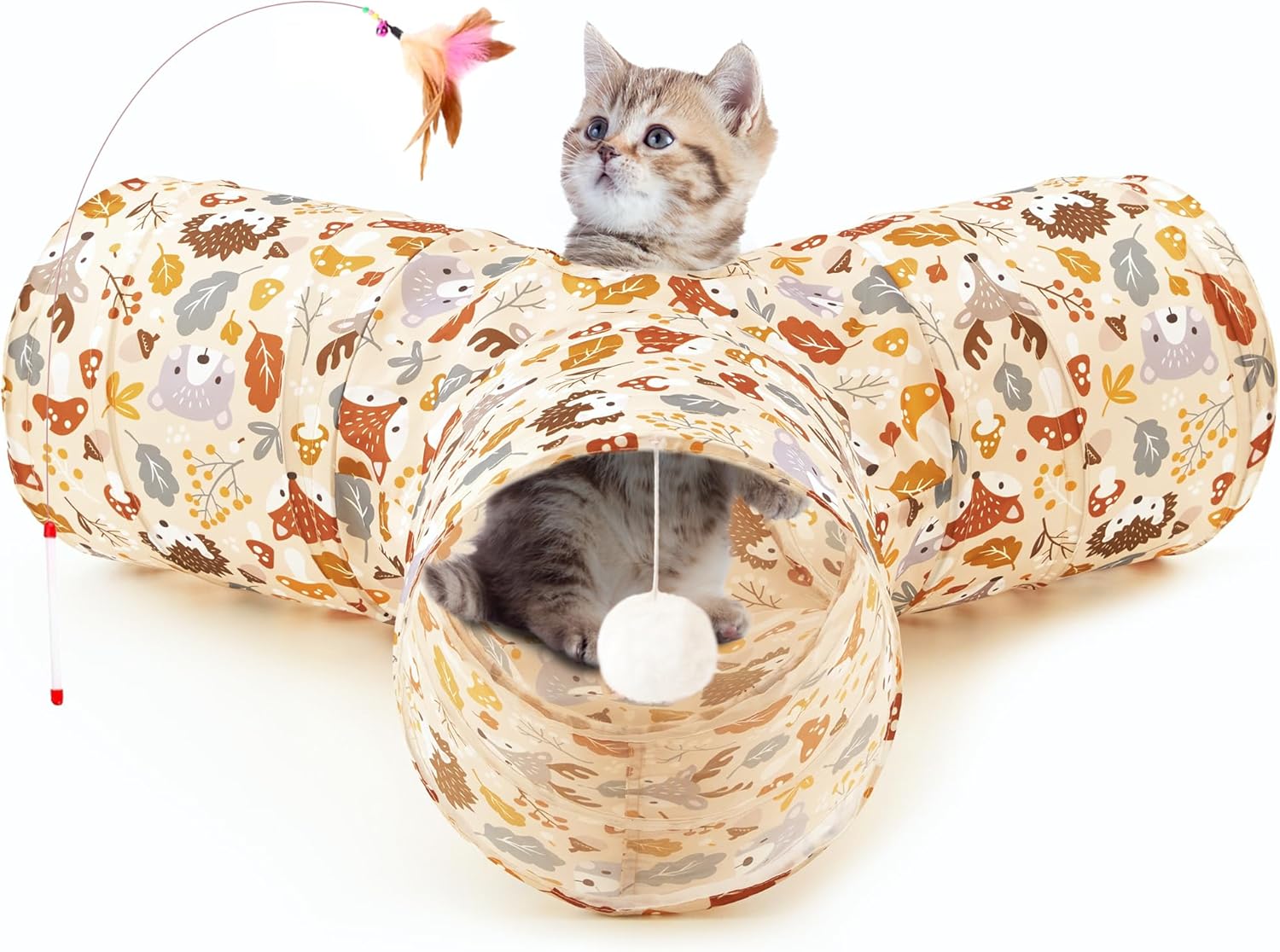 Tempcore Pet Cat Tunnel Tube Cat Toys 3 Way Collapsible, Cat Tunnels for Indoor Cats,Kitty Tunnel Bored Pet Toys Peek Hole Toy Ball Puppy, Kitty, Kitten, Rabbit Beige Deer