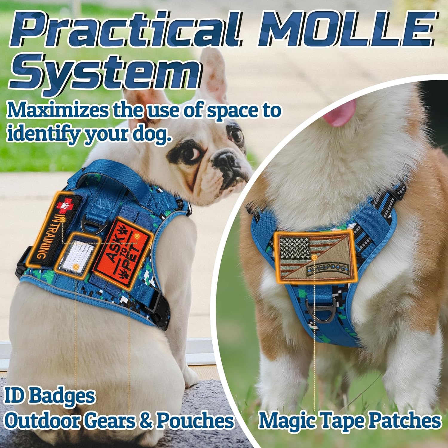 - More DIY Space: MOLLE system equipped on both sides of the tactical harness for pouches, water bottles and outdoor gears. You can attach personalized badges, morale patches on the hook & loop panels. Insert the ID card into the card slot to identify your dog. Widely used for personal service, law enforcement, hunting, or outdoor recreation