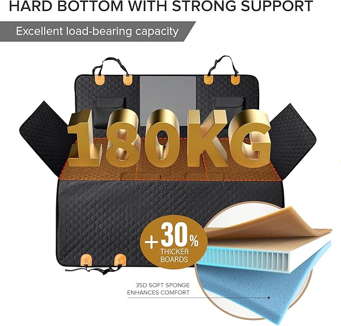 - 7-LAYERED CONSTRUCTION FOR SUPERIOR SUPPORT AND COMFORT - Crafted from durable materials 600D scratch-resistant Oxford cloth, waterproof fabric, reinforced hard bottom boards, 35D soft sponge, and cotton layers, this truck seat cover for dogs offers comfort and a non-slip surface. It shields your truck from damage, with an extra-high door flap to prevent scratches, allowing dogs to enter and exit without hassle