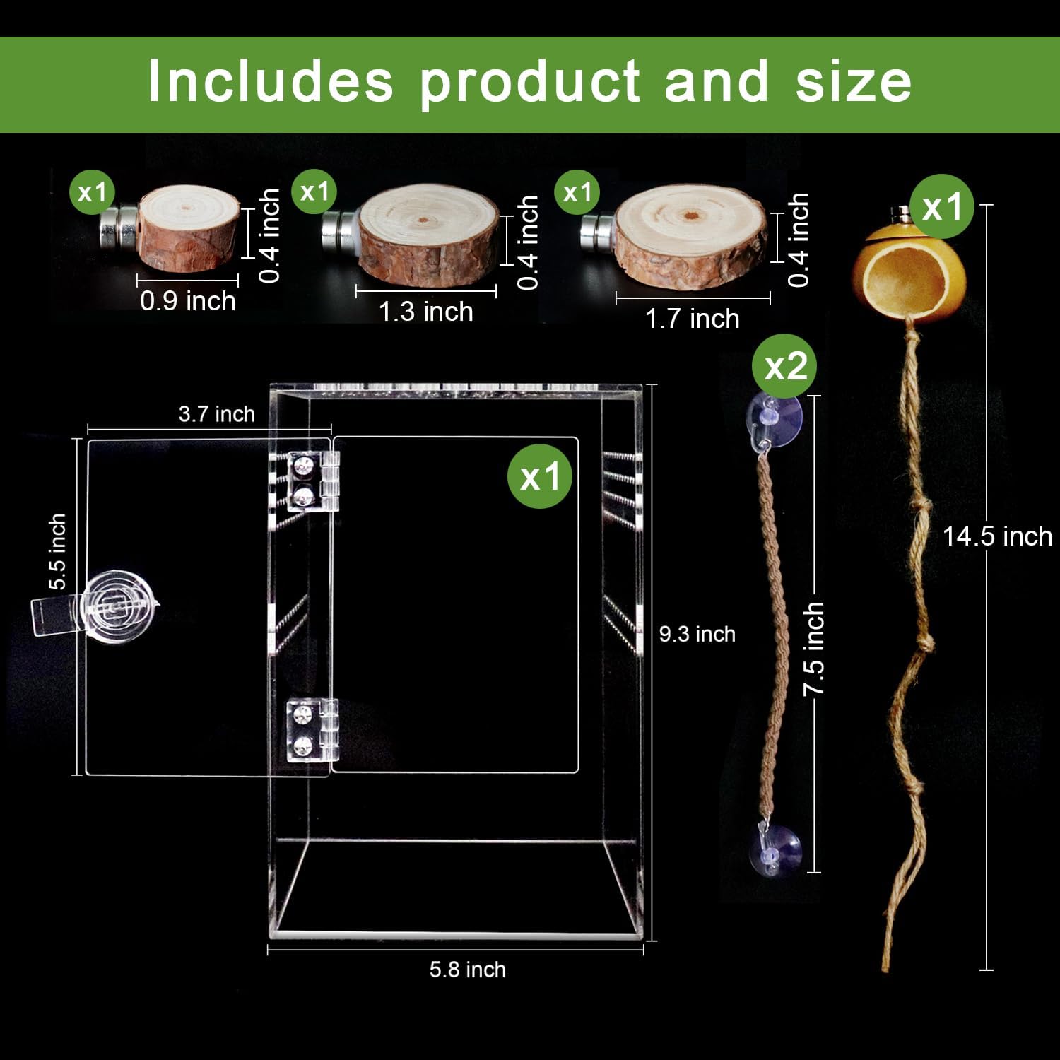 - 【Package Include】1pcs 6*6*9 inch Jumping Spider Enclosure; 1pcs Spider Ledge Ladder with Magnets; 1pcs Jumping Spider Hideout; 1pcs Spider Rope Bridge. (Breeding box Vent diameter: 0.02 inches/0.5 mm. Perfect for jumping spider, mantis, snail and arboreal tarantula and other small tree dwelling reptiles.)