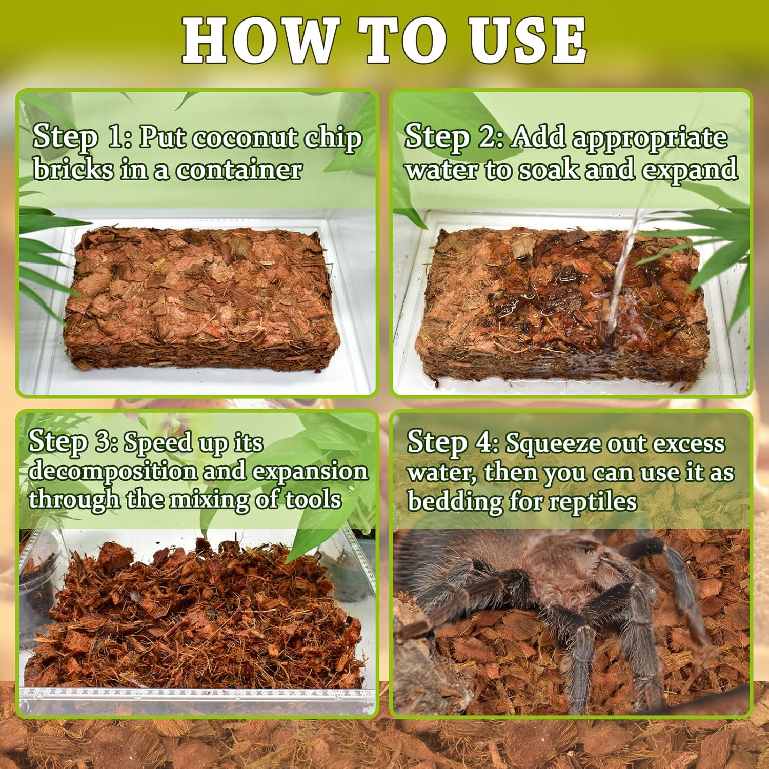 - What You Will Receive: You will get 3 PCS in 1.1 LB compressed coco coir chip brick. It will expand into loose coco chips after water absorption, each loose coco chips is about 10 mm ~ 35 mm, which is an ideal coconut substrate for reptiles