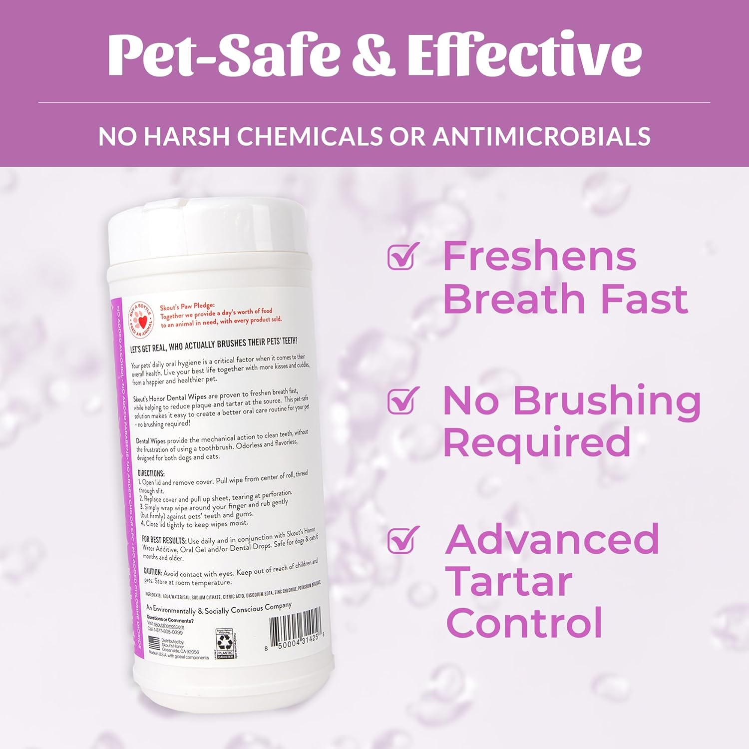 - Fights Plaque and Tartar - Skout's Honor Pet Dental Wipes help reduce plaque and tartar at the source, ensuring your pet's teeth stay clean and healthy.