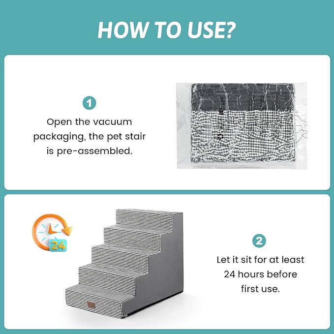 - Easy to Use: Dog stairs are vacuum-compressed and packed together after assembly, so after taking it out of the vacuum-sealed package, please let the sponge sit for 48 hours to expand before use fully. Slight wrinkles on the cover sides may appear after unpacking but can be smoothed out by washing or ironing