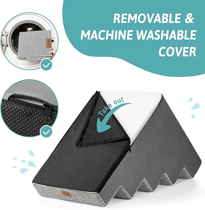 - Non-Slip Base and Removable Cover: Our dog steps for beds are equipped with a non-slip base featuring rubber dots for additional grip, minimizing movement during use. The pet steps cover is waterproof on the inner side, so you don’t have to worry about stains seeping into the foam. The outer cover is removable and machine washable for easy cleaning
