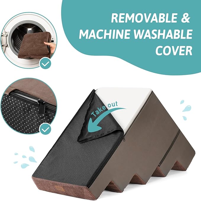 - Non-Slip Base and Removable Cover: Our dog steps for beds are equipped with a non-slip base featuring rubber dots for extra grip, minimizing movement during use. The pet steps cover is waterproof on the inner side, so you don’t have to worry about stains seeping into the foam. The outer cover is removable and machine washable for easy cleaning
