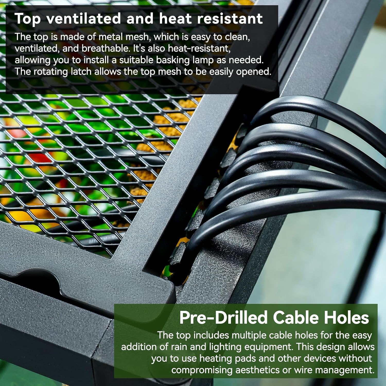 - 【Pre-Drilled Cable Holes】The top includes multiple cable holes for the easy addition of rain and lighting equipment. This design allows you to use heating pads and other devices without compromising aesthetics or wire management, making it suitable for any reptile tank, from a snake cage to a crested gecko tank.