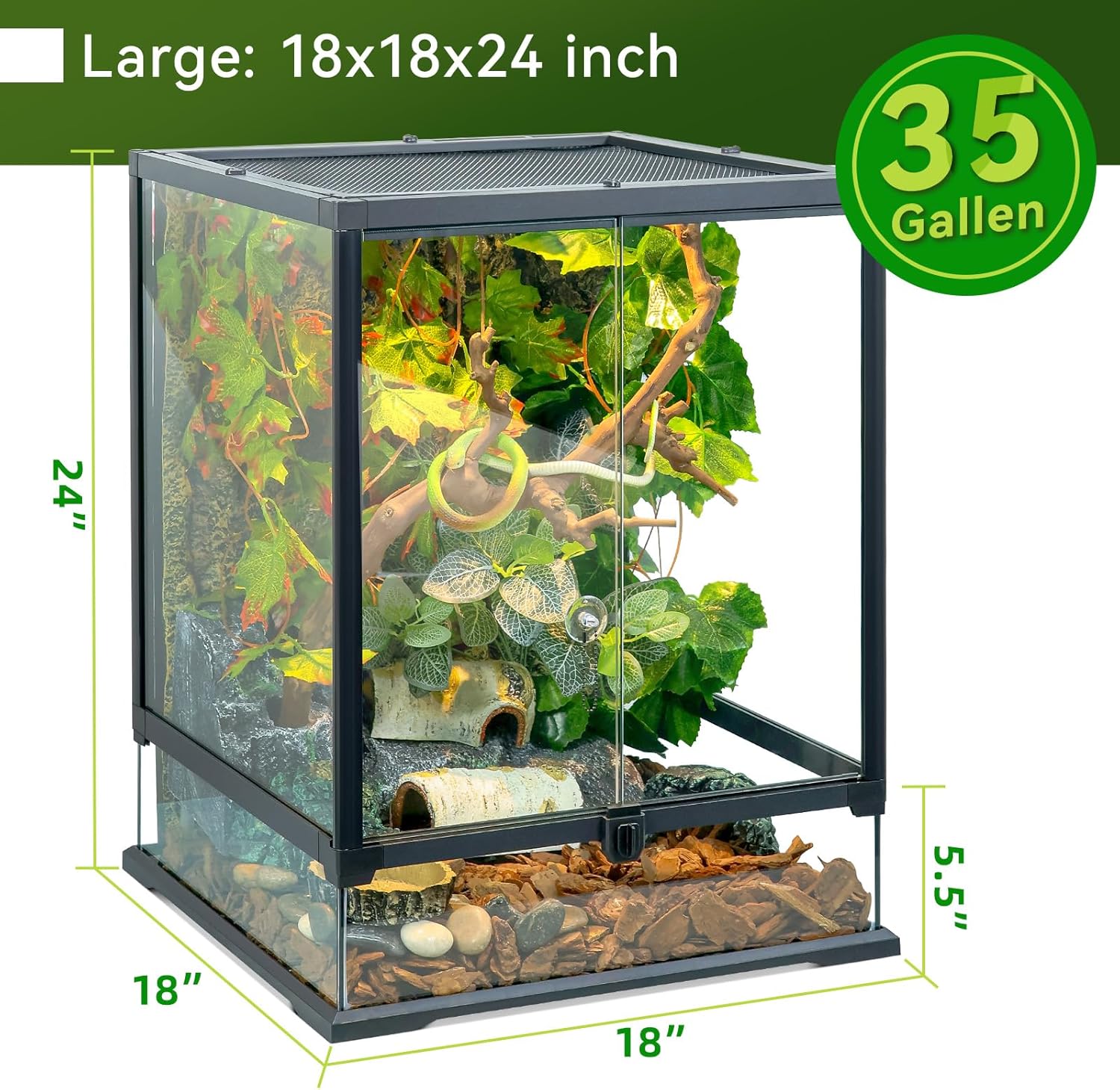 - 【Convenient Front Door Design】Equipped with an anti-escape latch and a pull suction cup door mechanism, this front opening terrarium design ensures safety while making feeding and cleaning efficient and convenient, perfect for a crested gecko tank or any other reptile habitat.