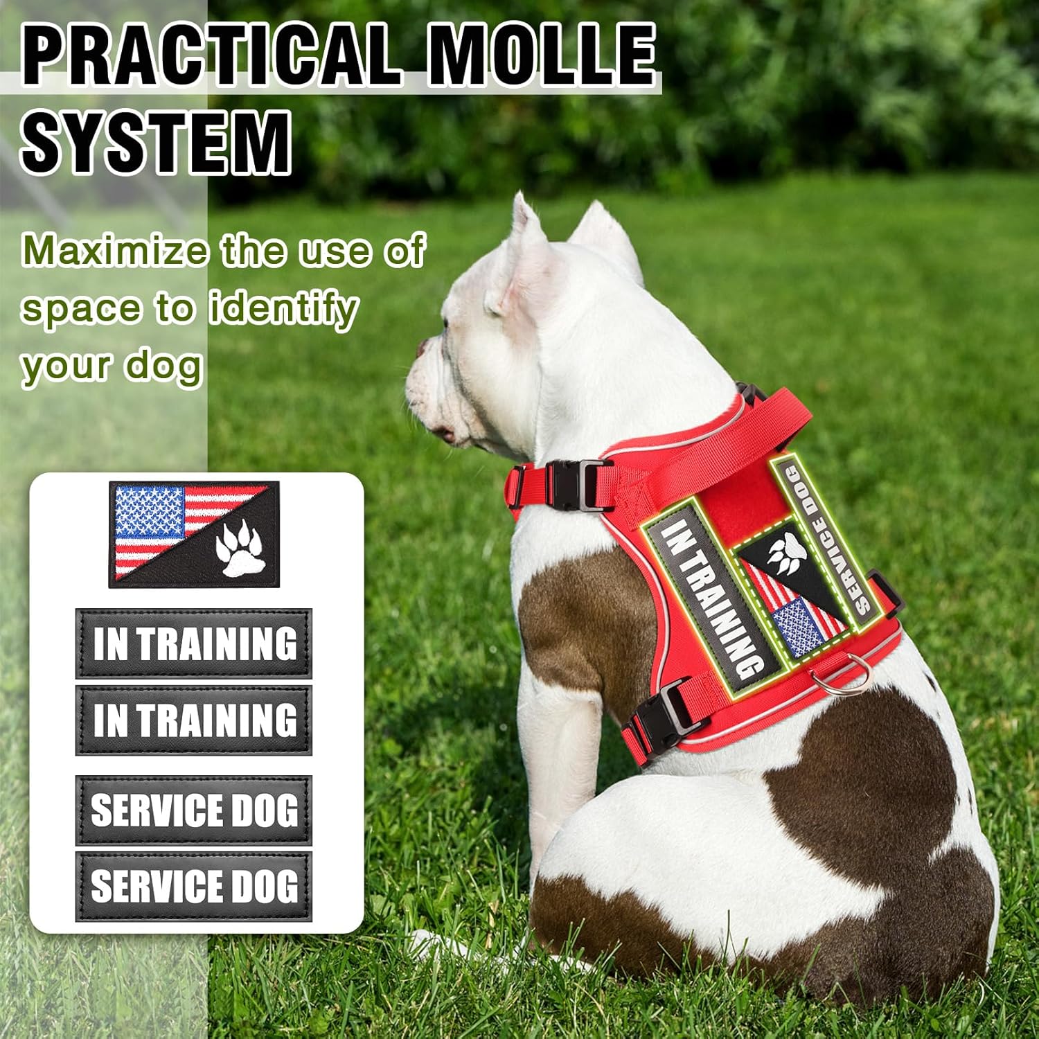 - 【MOLLE System & 5 Velcro Patches】: The package contains a WINSEE dog vest harness and 5 pieces of dog patches. This Service dog vest features molle system equipped on both sides. You can attach the patches such as “ “Service dog”, “in training” and 1 dog paw patch when walking or training the dog outside.