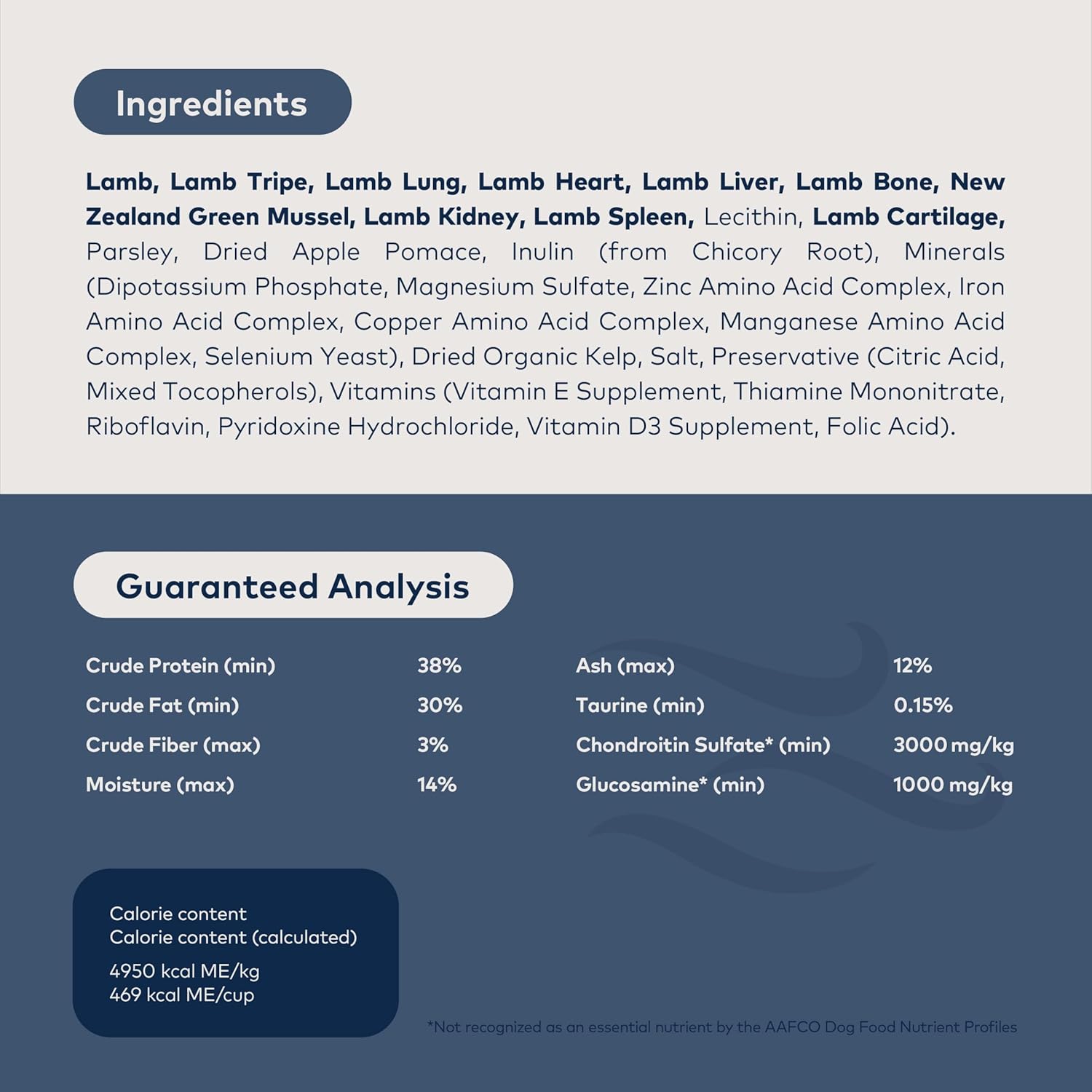 - HIGH PROTEIN, NUTRIENT DENSE: Featuring free-range Lamb, Organs, Bone, and New Zealand Green Mussels, this grain-free dog food delivers nutrition with a mouth-watering taste for all dogs. Gentle air dried processing retains the goodness of the raw ingredients. This food offers stimulating crunchy texture small enough for puppy food but soft enough for senior dog food.