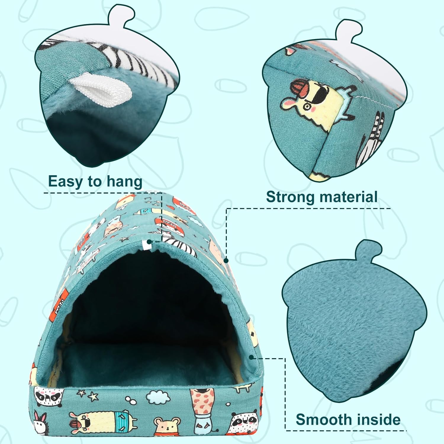 - Friendly Design: Adopting dark blue, the hamster nest is not easy to get dirty,very practical to use, with bright and beautiful patterns. The integrated design avoids accessories from slipping out and can also provide protection for the claws of small animals from being caught. The thickened inner cushion makes the Guinea pig bed stand upright and not easily deformed