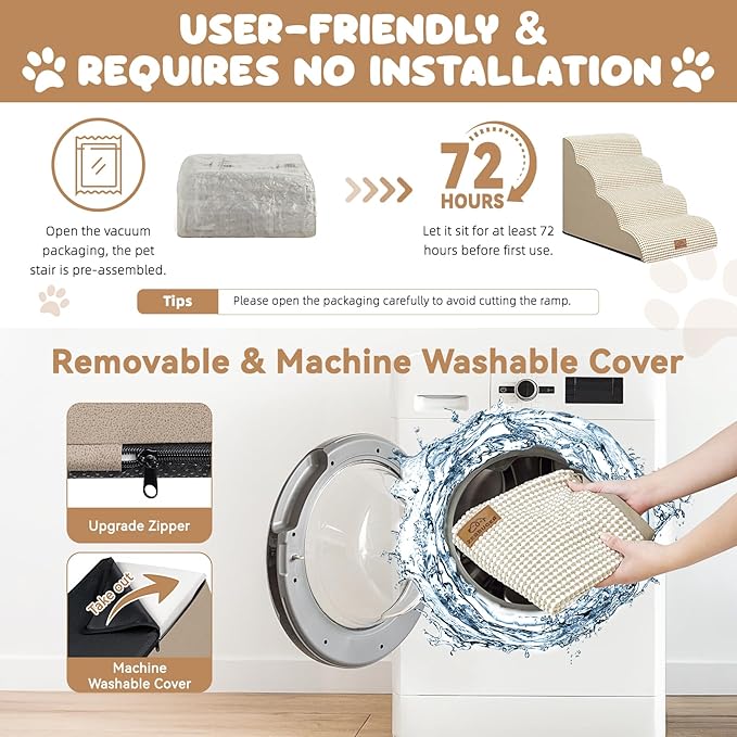 - No Assembly Required & Easy to Clean: When you open the packaging, the pet stair is already assembled. Before the first use, it should be left standing for at least 48-72 hours for the foam to fully expand. NOTE!! Open the packaging carefully to avoid cutting the stair! The outer cover can be removed for cleaning and supports machine washing or hand washing. Please note that the inner foam is not washable.