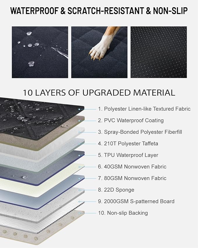 - Waterproof, Scratch-resistant & Non-slip: Constructed with 10-layer materials including PVC coating, TPU and 210T polyester, this dog back seat extender resists spills and wear. The 8mm high-density sponge and S-patterned board ensure stability, while the polyester linen-textured surface provides grip and scratch resistance.