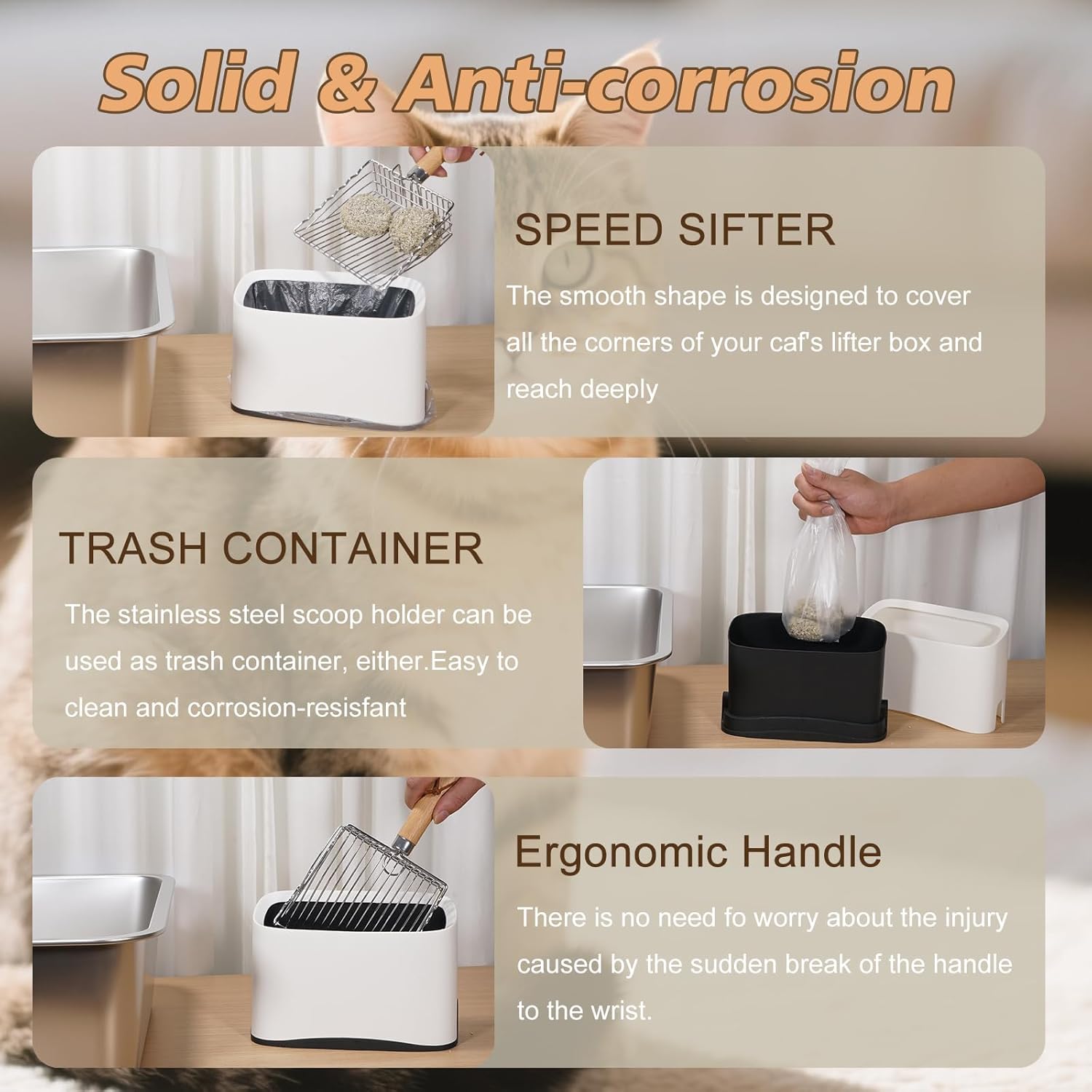 - 【High quality materials】Our cat litter scoop is made of high-quality corrosion-resistant stainless steel material, and the garbage scoop bracket is made of durable PP material, which is long-lasting and reduces the cost of frequent replacement
