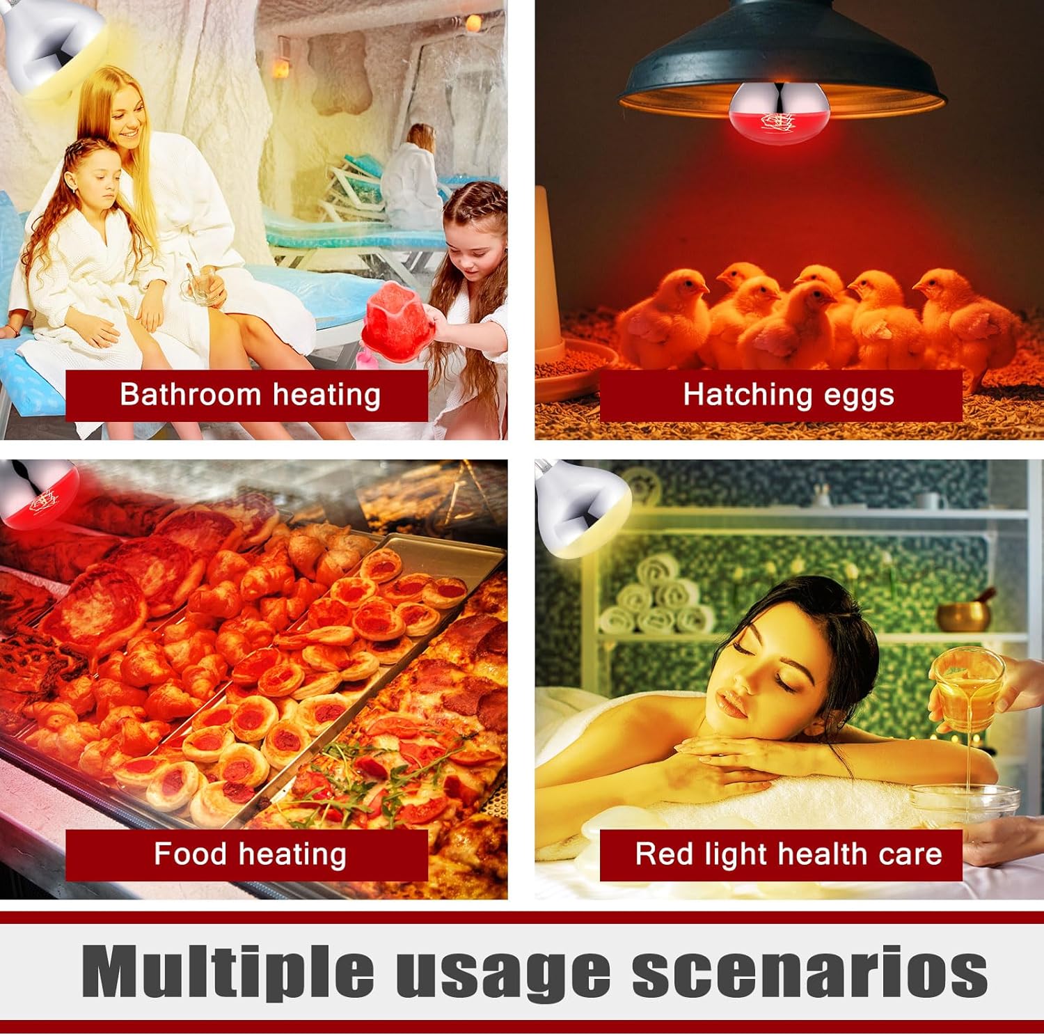 - Practical and Versatile: there are 6 pieces of bathroom heat lamp bulbs, which are an essential tool for pet owners and farmers alike; With their standard E26 medium screw base design, these bulbs are easy to operate and install, making them suitable for a wide range of occasions; They can be applied to provide radiant heat to keep your pets warm, create a sunbathing area for temperature adjustment, and even make reptiles and amphibians more active and comfortable