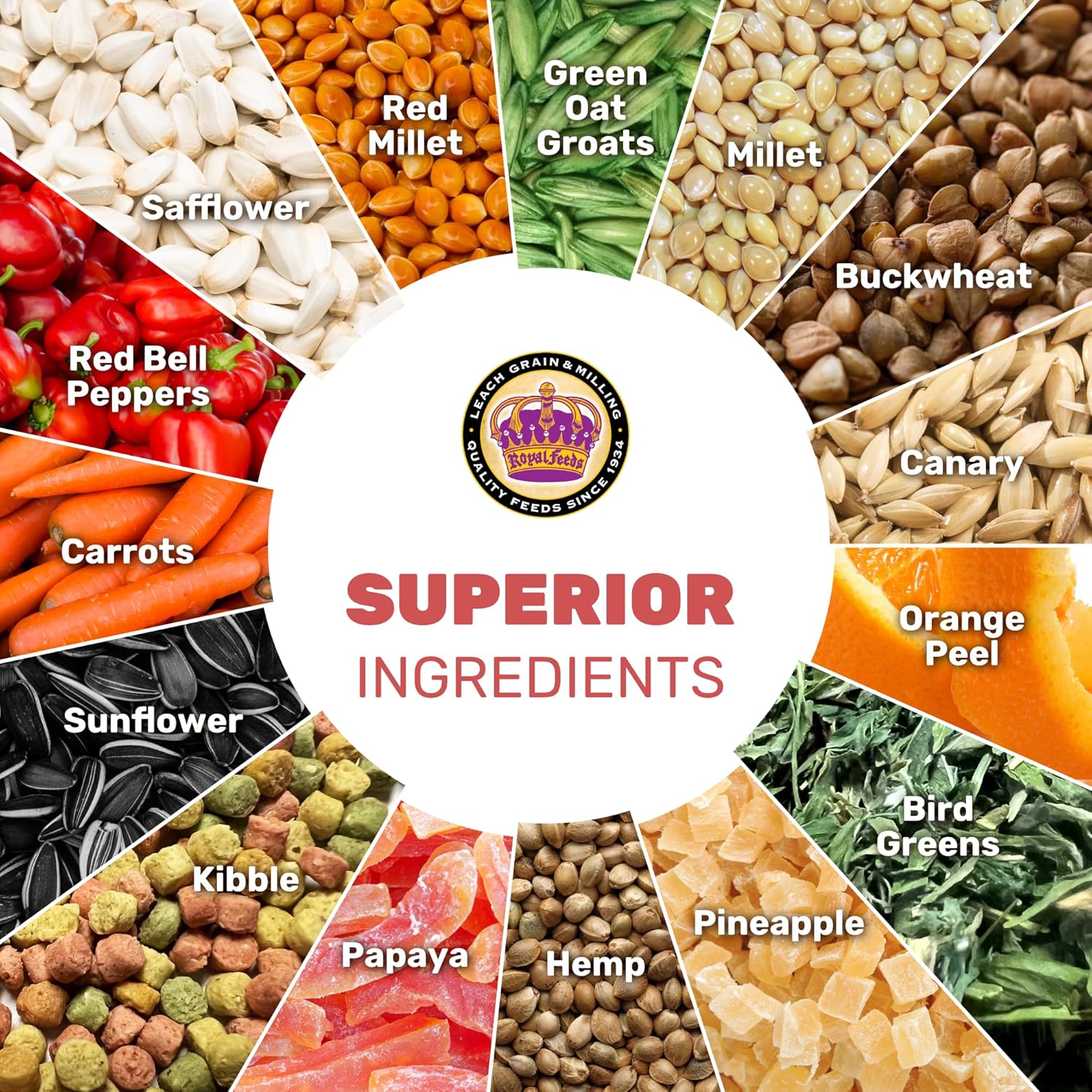 - 𝐌𝐀𝐃𝐄 𝐖𝐈𝐓𝐇 𝐑𝐄𝐀𝐋 𝐈𝐍𝐆𝐑𝐄𝐃𝐈𝐄𝐍𝐓𝐒 – Made with a wholesome mix of top-quality grains, seeds, dried fruits, and vegetables, including canary seeds, millet, sunflower, safflower, papaya, pineapple, red bell peppers, and more. These ingredients closely resemble what birds would eat in the wild, providing them with the variety and nutrition they crave while promoting better digestion, beak strength, and immunity.