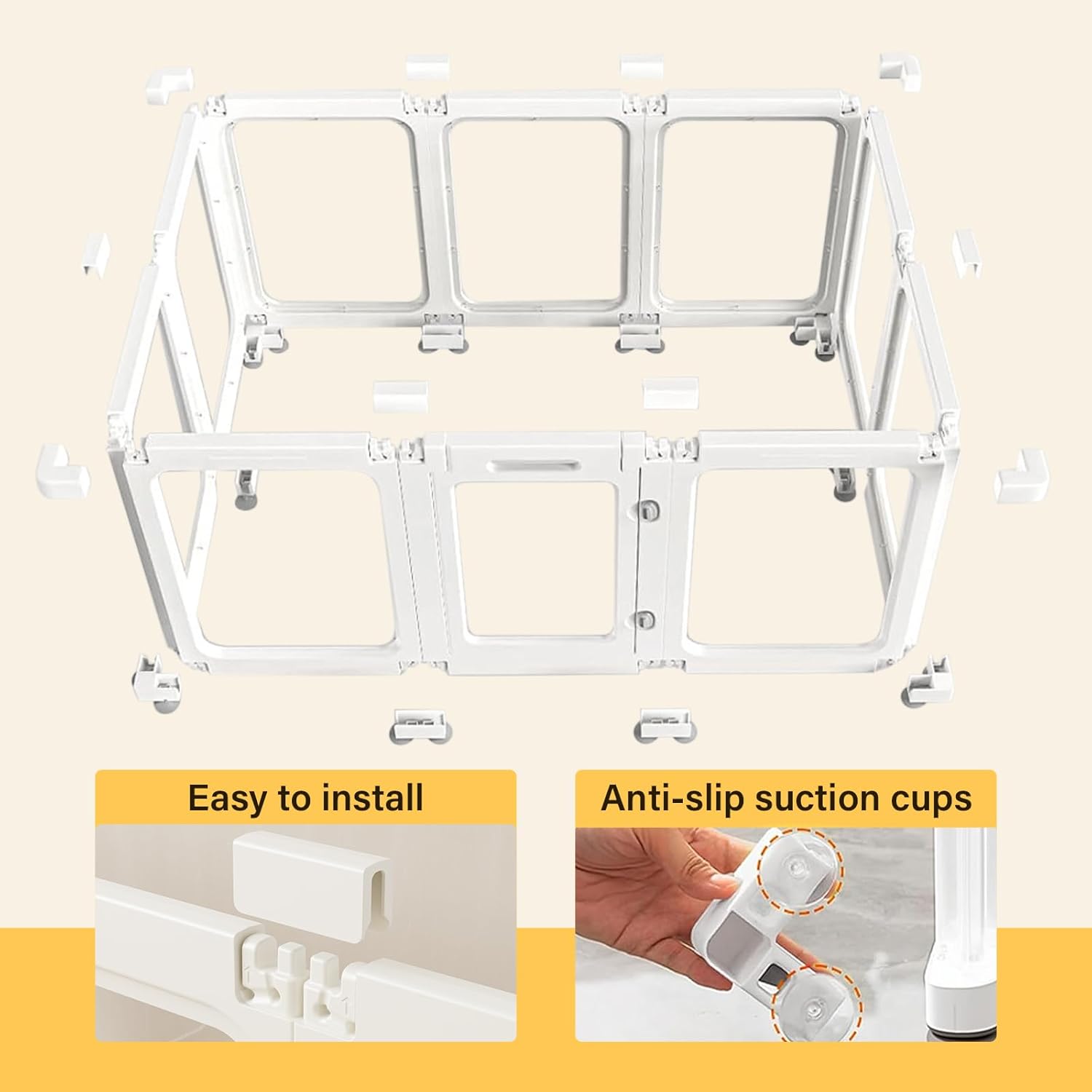 - 【Sturdy Construction】Made from high-quality plastic and acrylic, this acrylic playpen for dogs is built to last. The durable materials ensure it can withstand the wear and tear of active pets while maintaining its sleek and modern appearance. Featuring non-slip suction cups and interlocking joints, this clear dog playpen stays firmly grounded on hardwood, tile, or carpet.