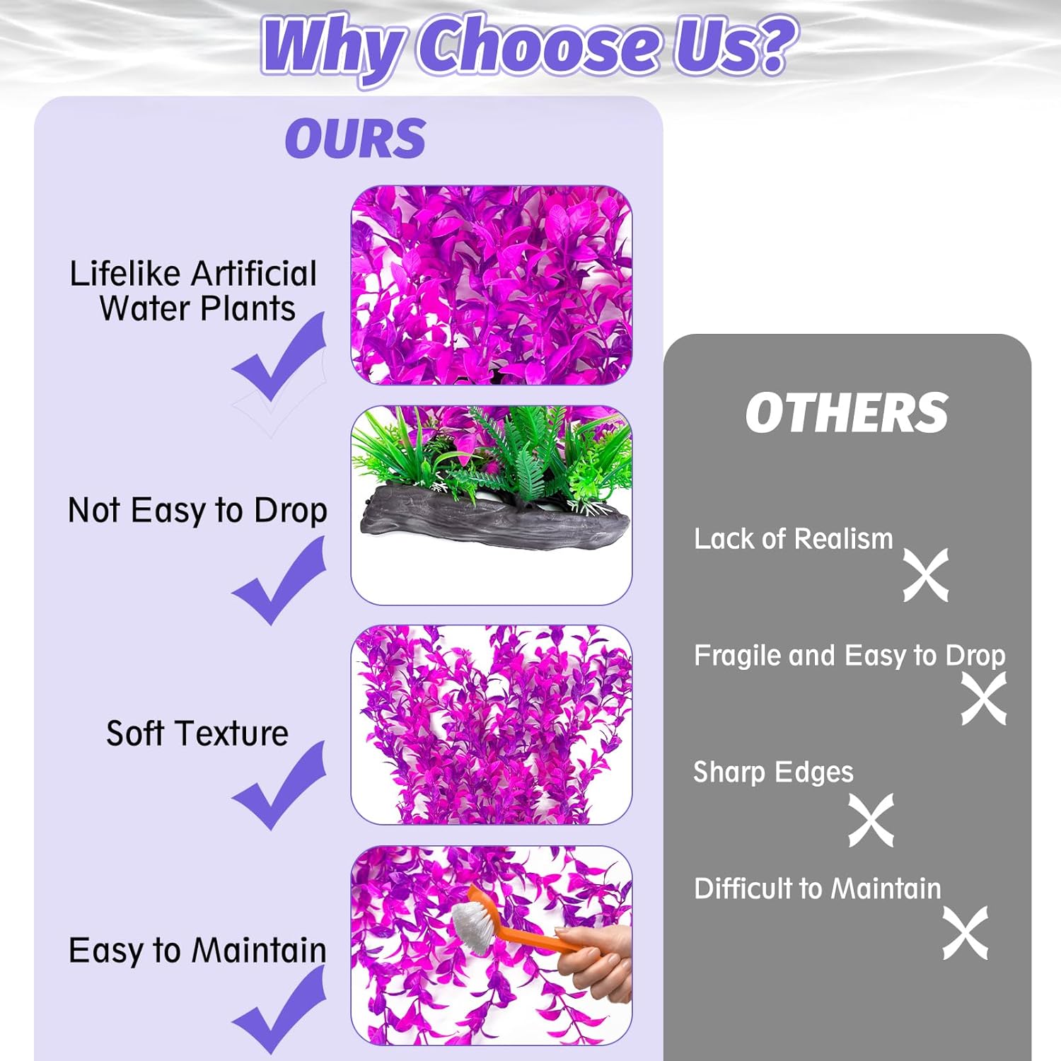 - RELIABLE MATERIAL OF FISH TANK DECORATIONS : Our fake water plant leaves and roots are made of soft plastic material that won't affect the water quality. The leaves do not have sharp edges and have a soft texture, which can effectively avoid any physical damage to the fish while swimming or playing, and aquarium decor can better beautify the e-nvironment, fish tank plants maintain stability and not fade. Fake aquarium plants provide a comfortable and clean living e-nvironment for fish. Whether placed in a saltwater e-nvironment or freshwater e-nvironment, aquarium plants plastic realistic can be perfectly adapted