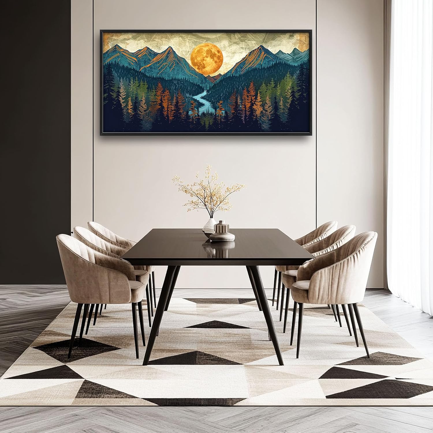 - 【Unique Design】An artwork of mountains and forests with the moon rising between them. Use muted earth tones, a forest green color for the trees, and a deep blue to depict the water flowing through the valley. The sky should have shades of grey or brown, with golden hues from the sunset casting on the mountain peaks. In the center is a large, orange sun shining over everything.