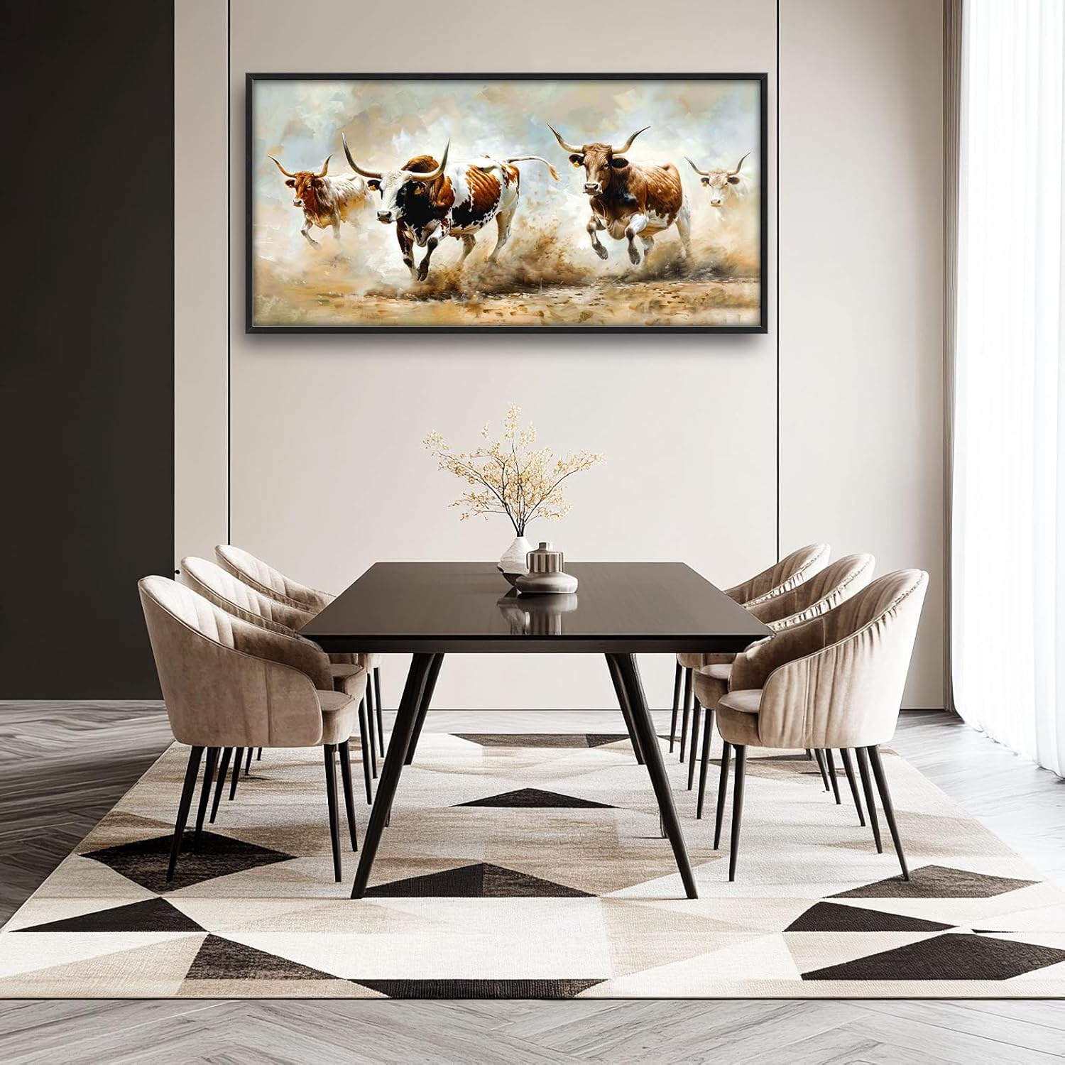 - 【Unique Design】A group of longhorn cattle running through the Texas desert, with detailed brushstrokes capturing their powerful motion and unique features, in an oil painting style with soft colors and dynamic lighting.