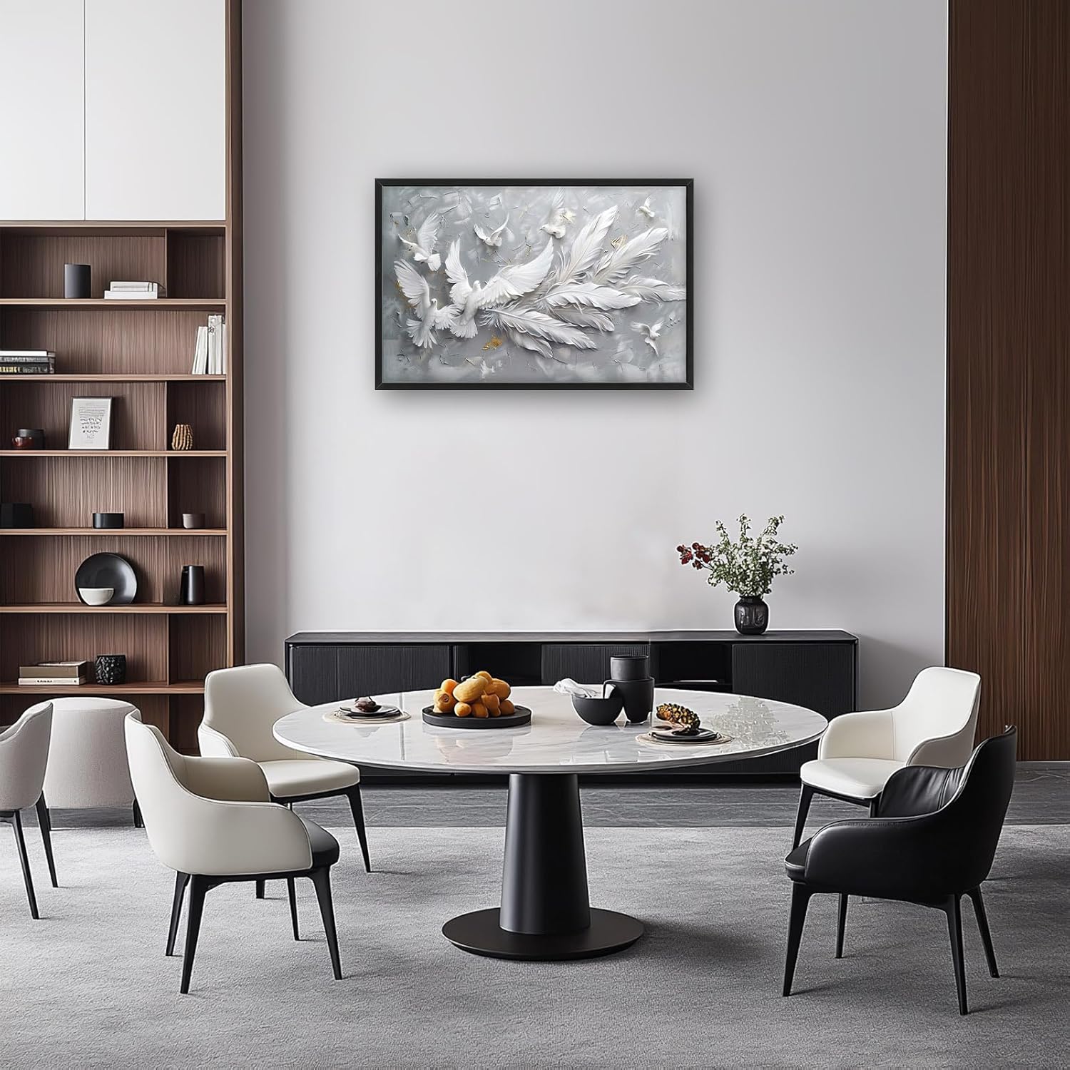 - 【Unique Design】3D abstract painting of white doves with long feathers, flying in the air. The background is gray and textured. There should be no shadows on it. In front, there will also be other light-colored birds, and they can have different shapes. Together, they form an artistic composition that symbolizes peace or freedom. White feathers on wings, full-length, high detail.
