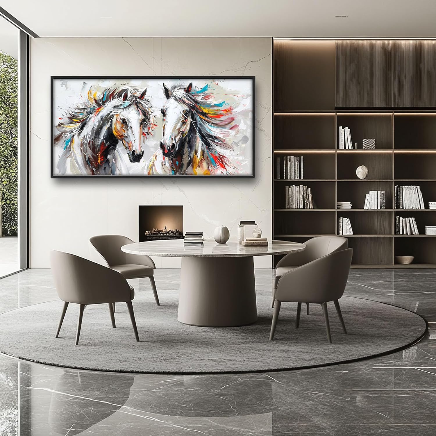 - 【Unique Design】Two horses with flowing manes, white background, colorful oil painting style, large brushstrokes, strong contrast between light and dark, fast running posture, bright colors, high saturation, strong sense of dynamism, elegant lines, gorgeous atmosphere.