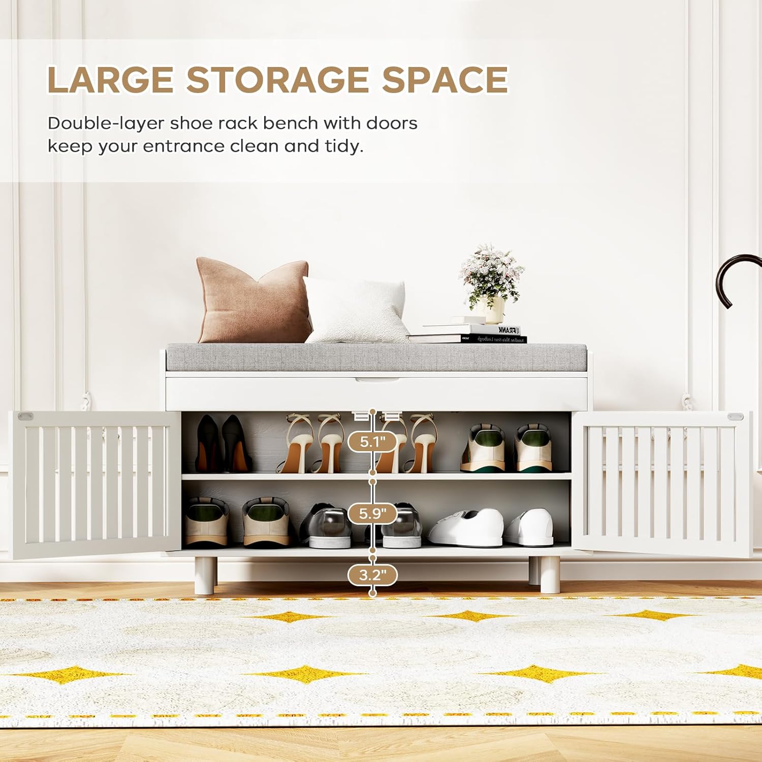 Storage Bench, Bamboo Shoe Bench with Padded Seat Cushion & 2 Doors, 2-Tier Entryway Bench with Lift Top Hidden Storage, 35.4" W x 12.6" D x 19.7" H, Shoe Rack Cabinet for Entryway, Living Room, White