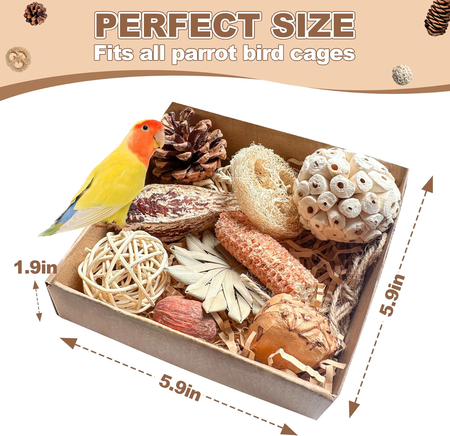 - 🦜 PERFECT FOR EVERY BEAK PERSONALITY: Shredders: Crunchy sunflower leaf discs & tearable grass paper Nibblers: Sweet mango wood & textured palm spirals Tossers: Bouncy sola balls & lightweight Ideal for conures, cockatiels, budgies, and more—no bird left behind!