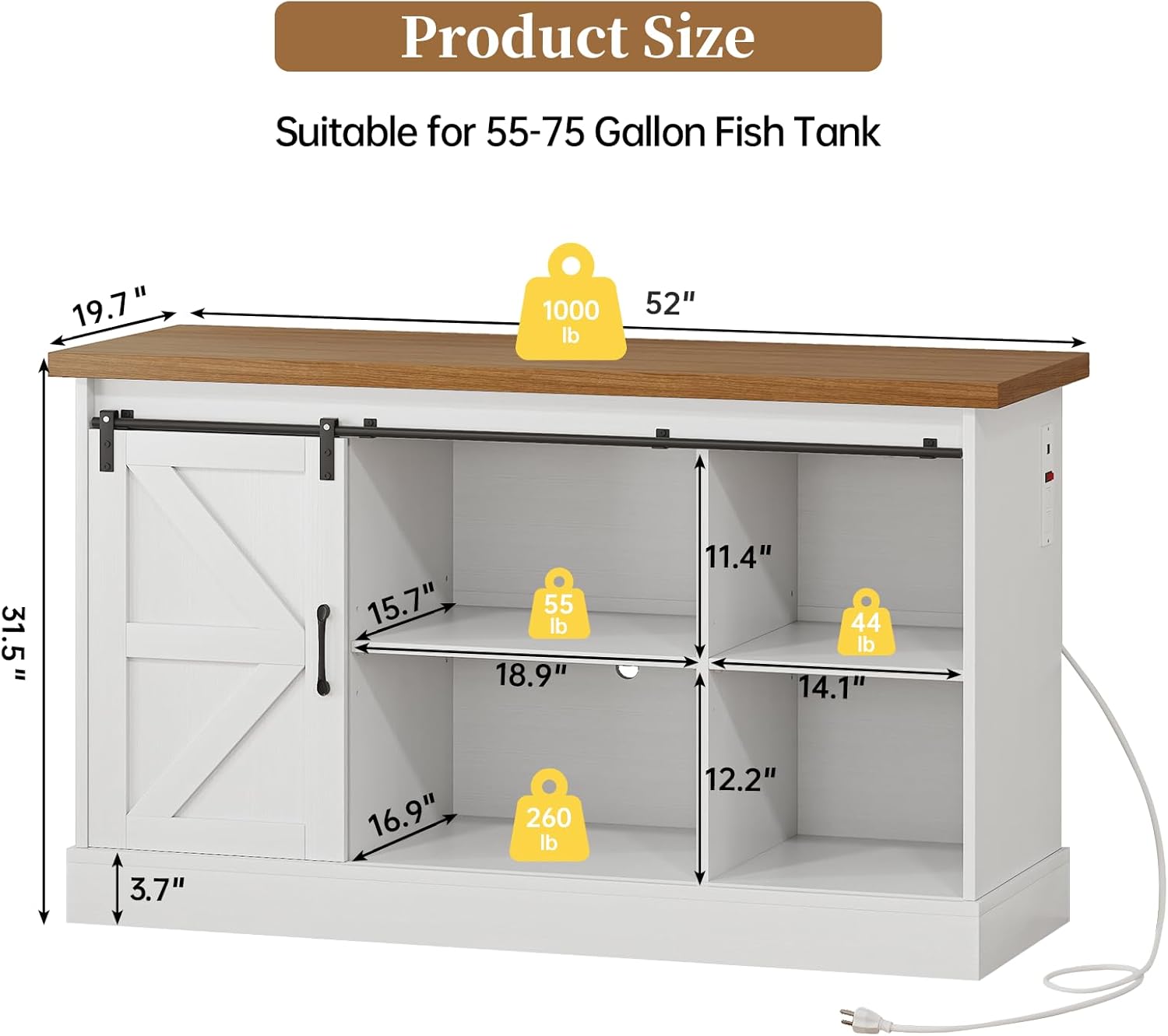 55-75 Gallon Fish Tank Stand with Sliding Barn Doors & Power Outlet, Heavy Duty Aquarium Stand with Cabinet Storage for Fish Tank, Turtle Tank, Reptile Terrarium, 1000LBS Capacity, White
