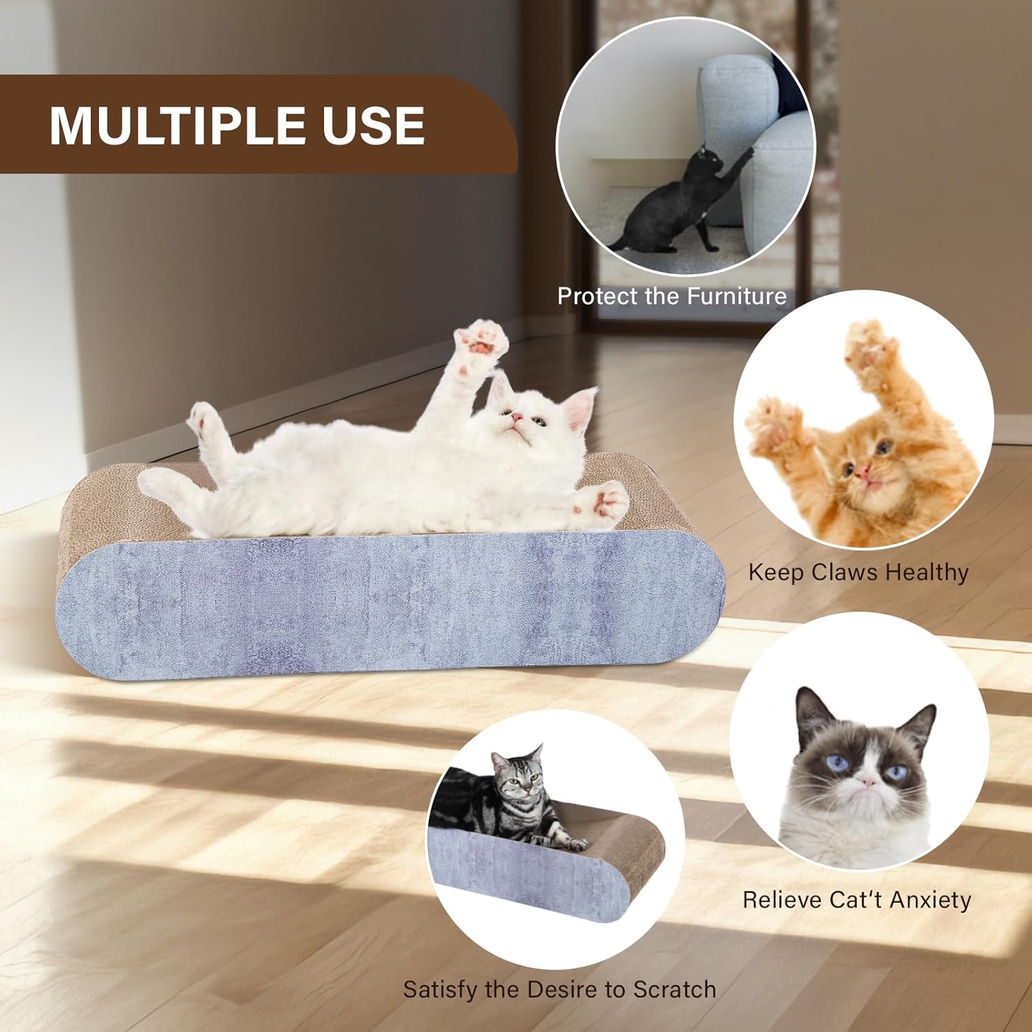 - FURNITURE PROTECTOR: This scratcher can fully satisfy cat’s scratching needs, effectively helping their claws healthy and protecting your floors, walls, doors, sofas, carpets, curtains and so forth.