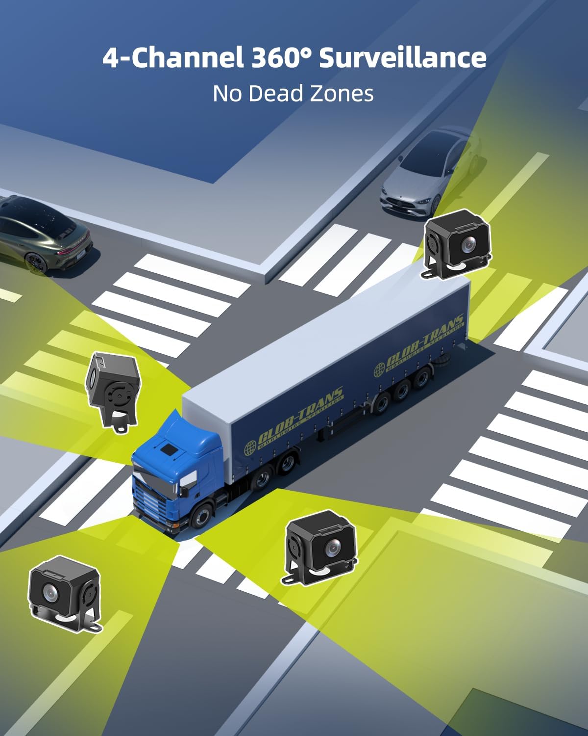 - 【Reversing Blind Spot Terminator】Based on the coordinated operation of four 1080P ultra-clear waterproof cameras, this system uses real-time image synchronization transmission technology to build a 360° panoramic bird's-eye view of the vehicle body, eliminating safety hazards in scenes such as reversing blind spots, side obstacles and narrow road encounters, and provides all-weather and blind-angle driving protection for commercial vehicles, passenger cars, and special operation vehicles.