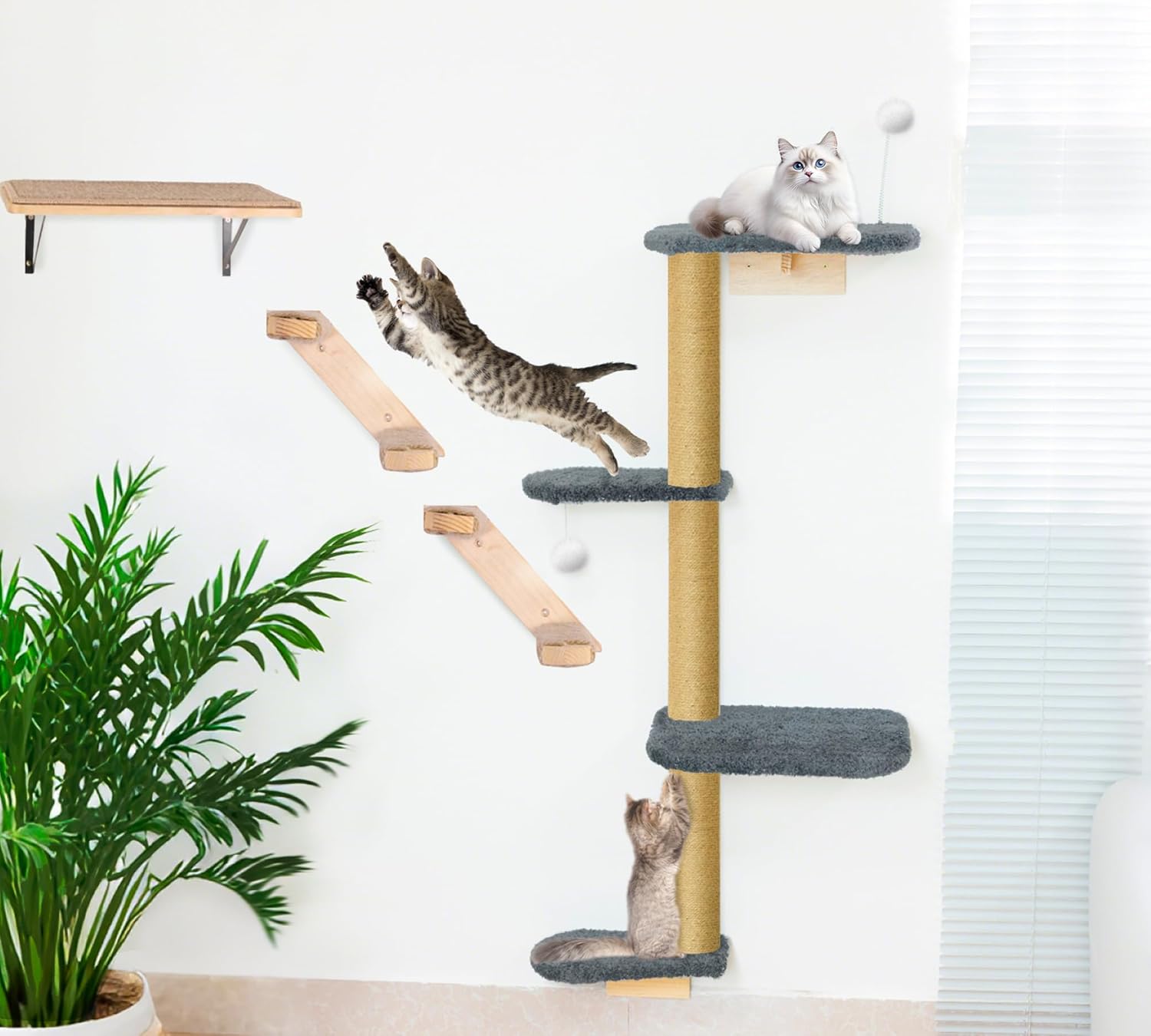 - Triple-Anchor Mount for Steady Support: This wall-mounted cat climber anchors at three secure points to ensure maximum stability. From climbing to jumping, your cat’s movement stays supported. The jute posts provide traction during ascent, and the soft plush cushions minimize impact when landing—keeping curious kittens safe and confident.