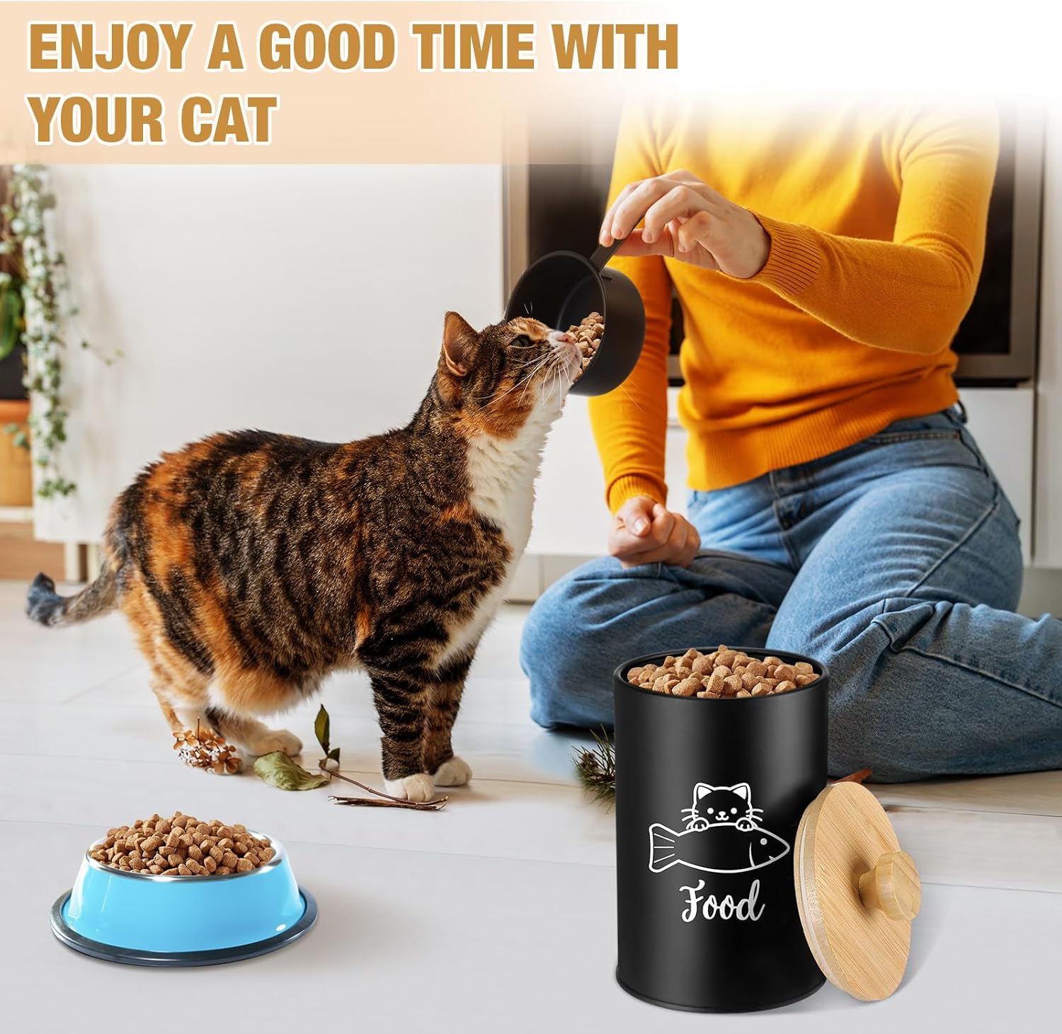 Metal Airtight Cat Treat Container Set of 3 with Bamboo Lids and Spoon Cat Food Storage Container with DIY Labels Pen Pet Cookie Snack Food Storage Organizer Jars for Kitchen Counter(Black)
