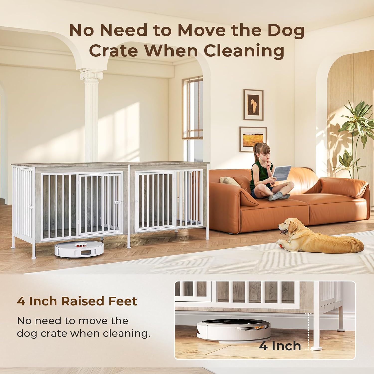 - Robot-Friendly & Easy to Clean: Raised 3.94 inches off the ground, dog crate furniture supports sweeping robots to pass through easily, making daily cleaning a breeze. The elevated base also prevents moisture buildup and keeps the bottom dry and hygienic for your pets