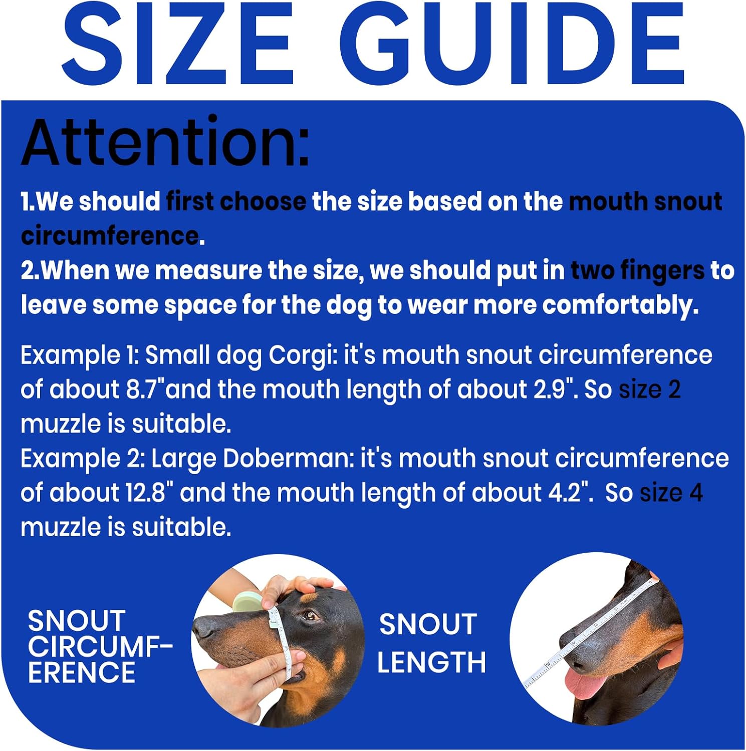 - PLEASE MEASURE BEFORE BUYING:Measure both snout circumference and snout length before purchasing. If your dog's snout length exceeds the size range by about 1 inch, choose the next size up. For long-snout breeds like Dobermans, make sure the snout length fits as well.