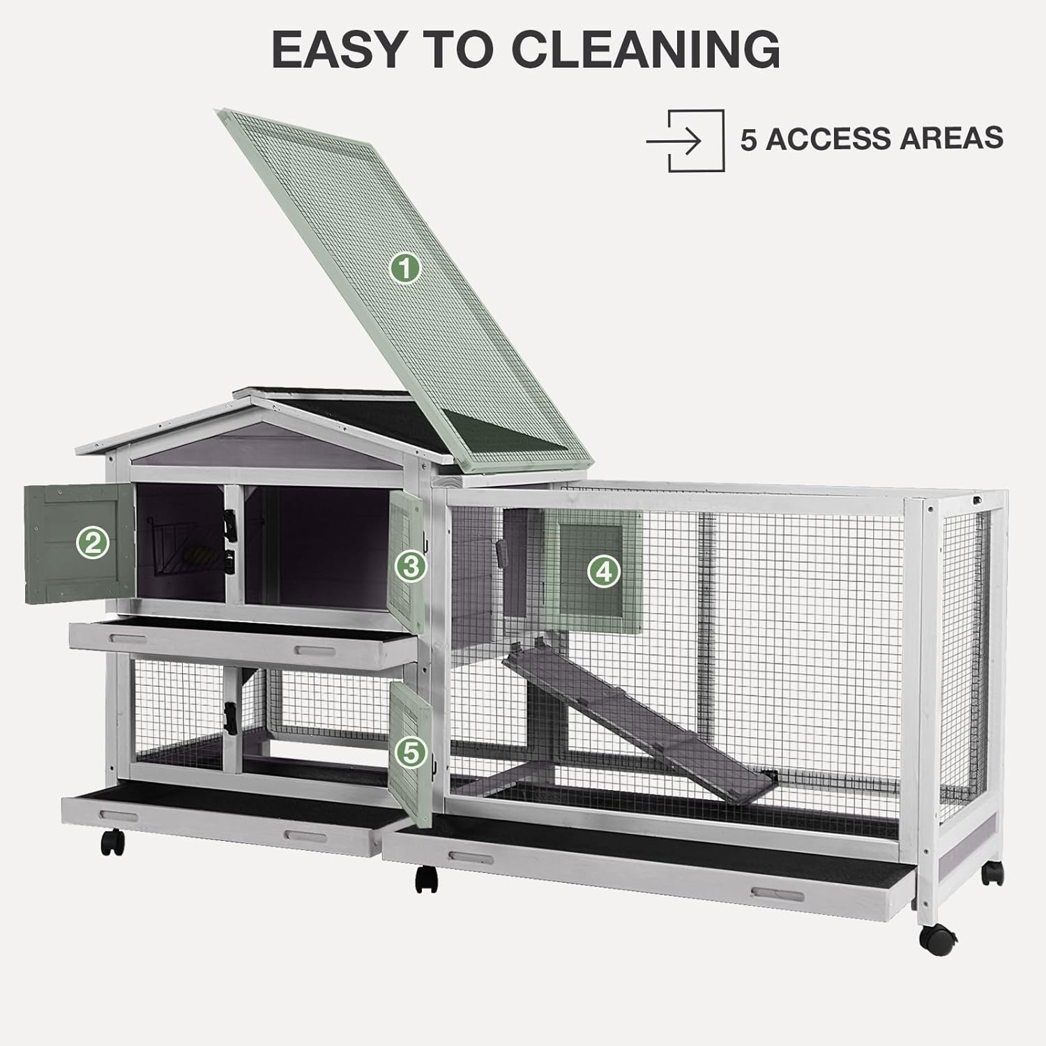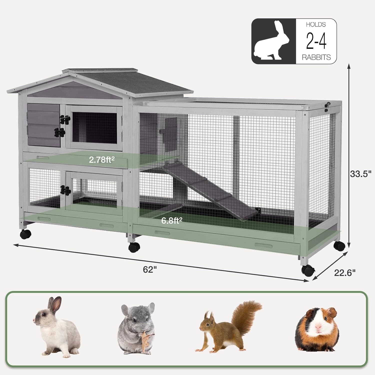 2-Story Indoor Rabbit Hutch with Chew-Proof Outdoor Rabbit Cage with 6 Locking Casters Bunny Cage 2 Pull-Out Trays Guinea Pigs Cage 62"