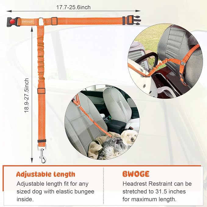 - ADJUSTABLE LENGTH: Dogs come in different sizes and weights. With buckle on the straps and the elastic bungee inside, The BWOGE Headrest Restraint is adjustable between 18.9-27.5 inches and can be stretched to 31.5 inches for the maximum length. The circle can be adjusted from 17.7 inches to 25.6 inches.You can easy to adjust the dog leash to the suitable length to keep your pet in a safety state.