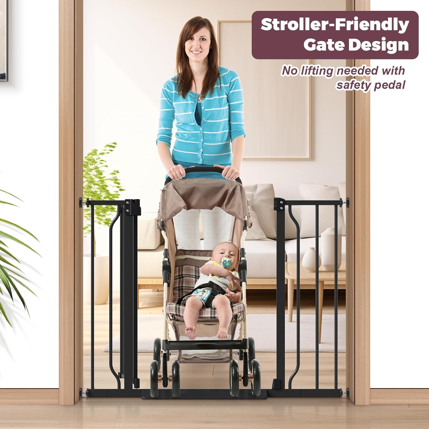 - Stroller-Friendly Baby Gate: Features an anti-stumble pedal, ensuring a seamless transition between the baby gate for stairs and the floor. This design reduces the risk of tripping and allows strollers to roll through effortlessly, making it ideal for families with elderly members and young children.