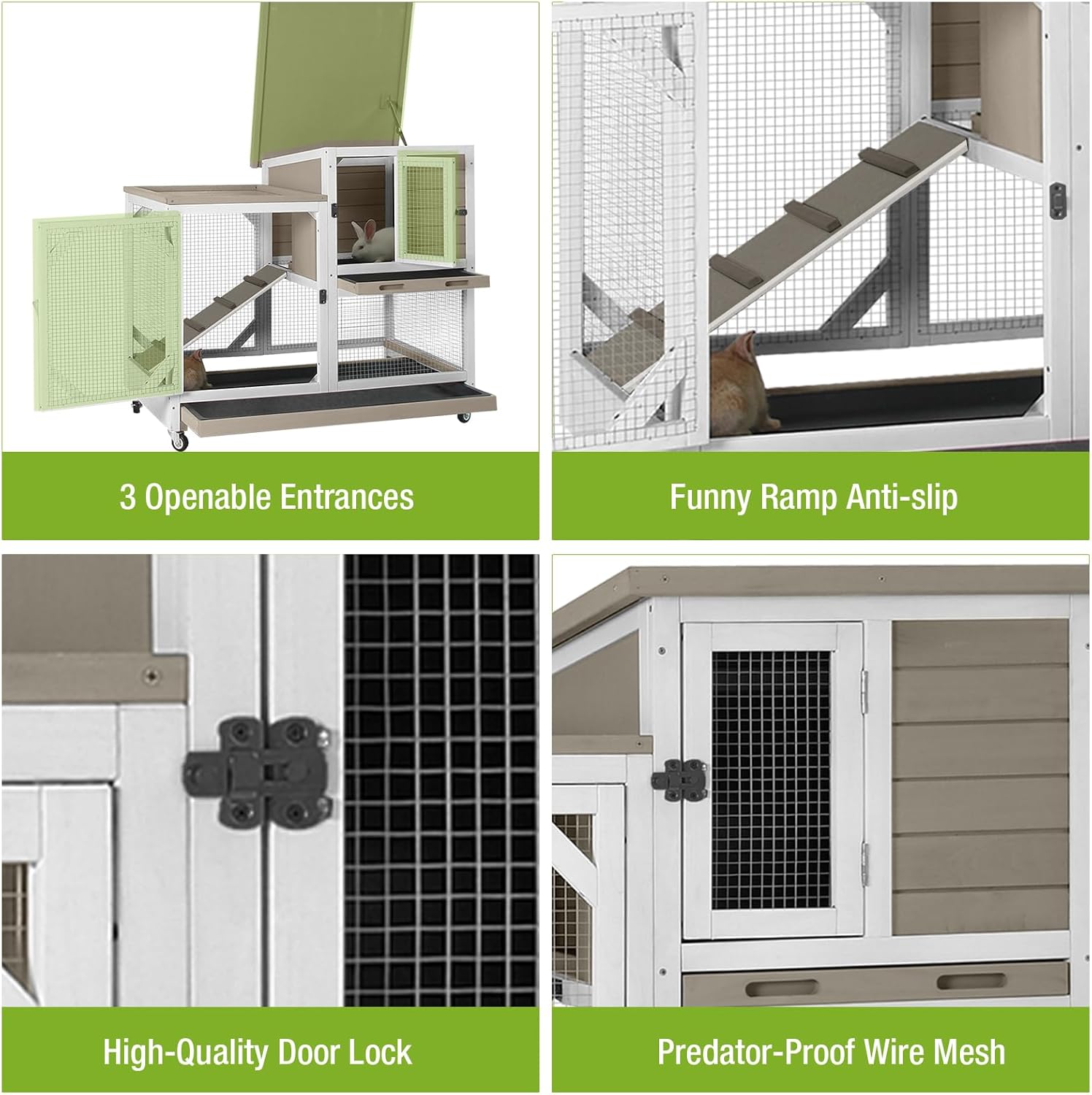 GUTINNEEN 2-Story Rabbit Hutch with Chew-Proof Ramp & Pull-Out Trays - Indoor/Outdoor 39.3" Wooden Rabbit Cage on Wheels for Rabbits, Guinea Pigs (Light Brown)