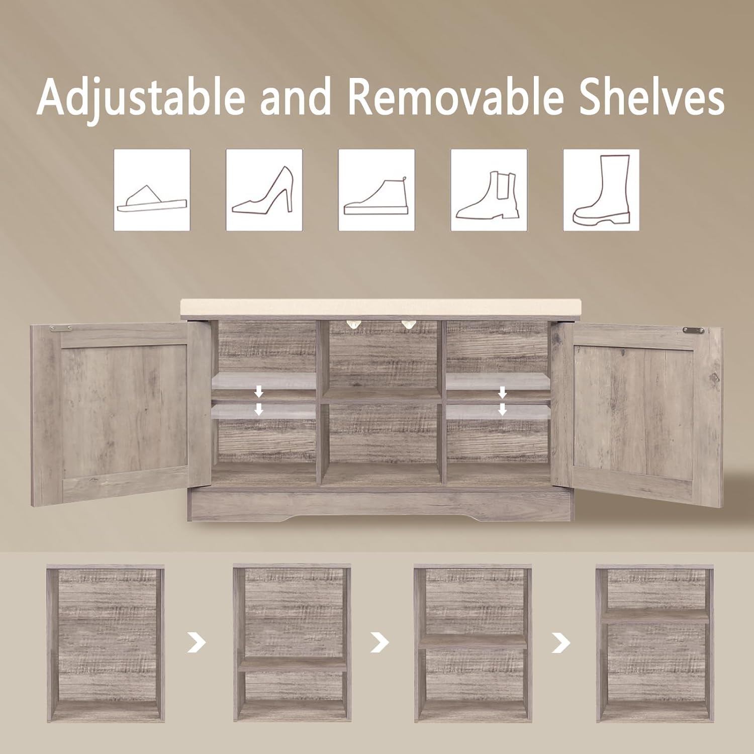 - 【Flexible for Multiple Needs】2 middle compartments are fixed for sneakers, high heels and sandals. The side compartments have 3 adjustable heights for slippers, tall boots or storage boxes. Use as an entryway bench, window seat or bedside bench to store blankets, books and toys in the living room and bedroom