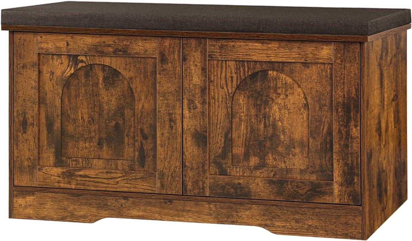 DINZI LVJ Shoe Bench, Entryway Storage Bench with Doors, Cushion, 2-Tier Shoe Rack with 6-Cubby, 31.5”L x 13.8”W Shoe Organizer Cabinet, Adjustable Shelf, Living Room, Bedroom, Rustic Brown