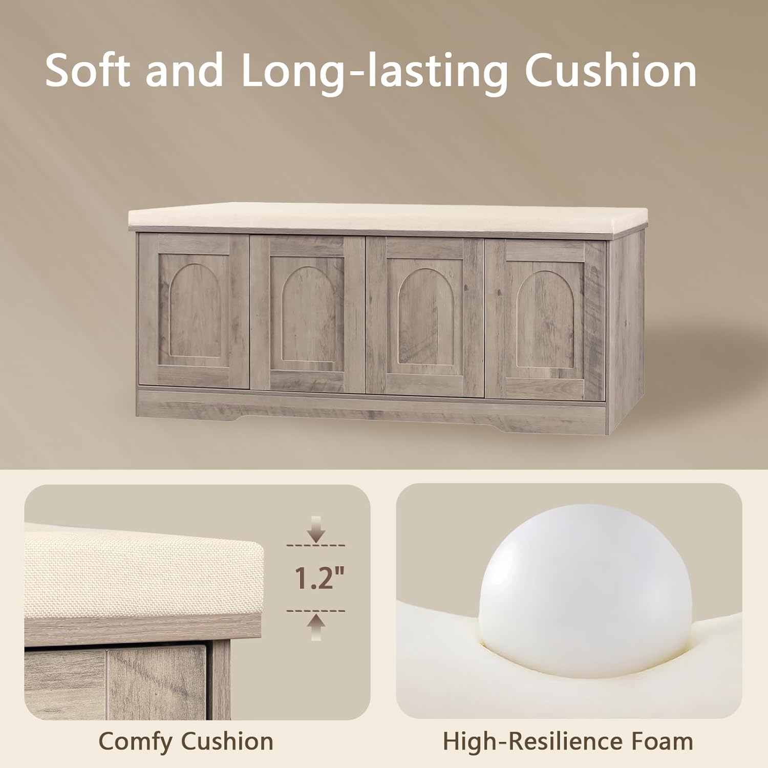 DINZI LVJ Shoe Bench, Entryway Storage Bench with Doors, Cushion, 2-Tier Shoe Rack with 8-Cubby, 47.2”L x 13.8”W Shoe Organizer Cabinet, Adjustable Shelf, Living Room, Bedroom, Greige