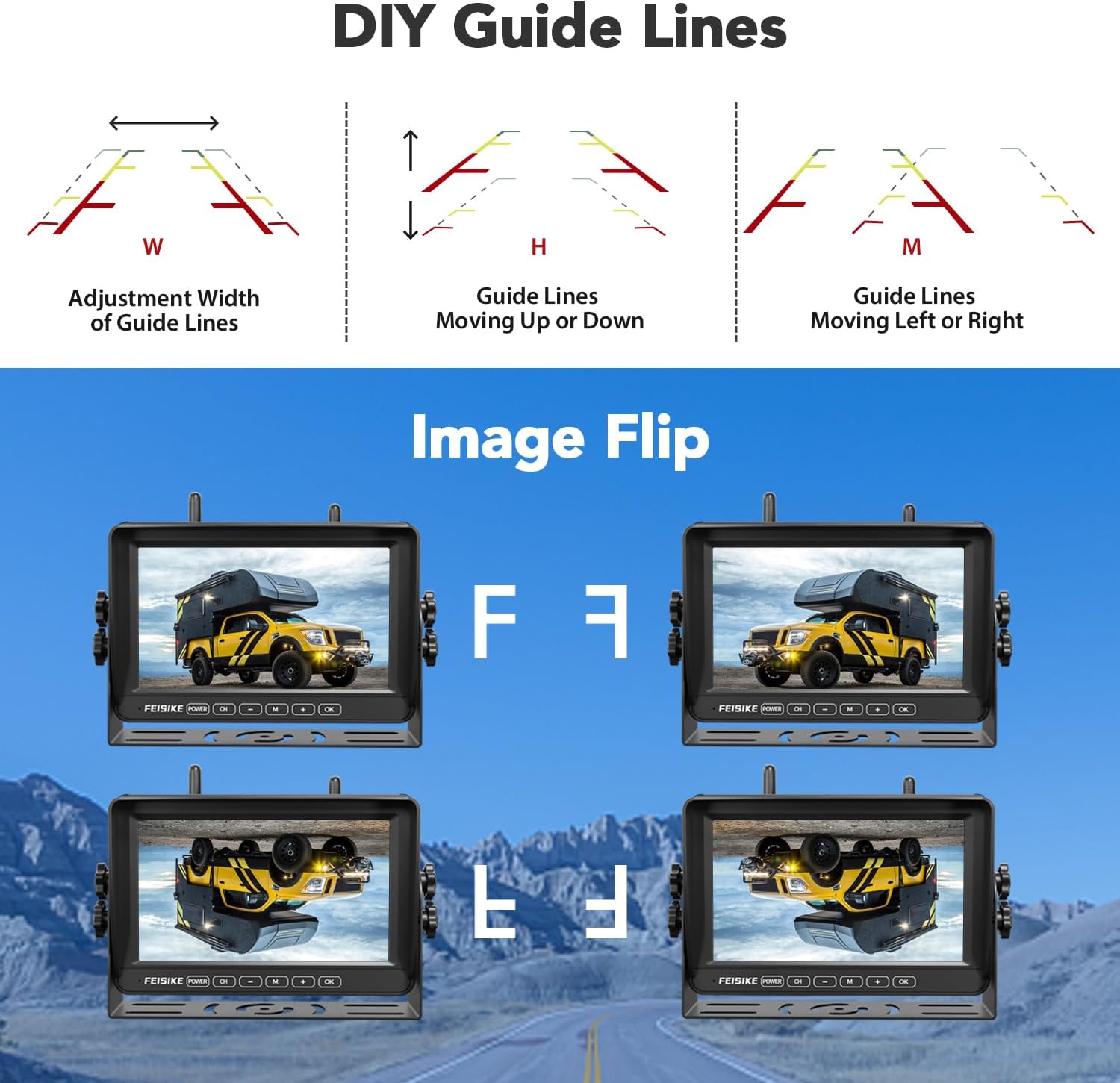 - 【4-Channel Support with Loop Recording】Connect up to 4 rv rear cameras (extra cameras sold separately) for full vehicle coverage. With loop recording support (SD card 8–128GB, not included), the trailer camera system wireless can automatically record and overwrite footage—perfect for long trips and incident capture. The 150° wide-angle lens offers a comprehensive view for safe driving and reversing.